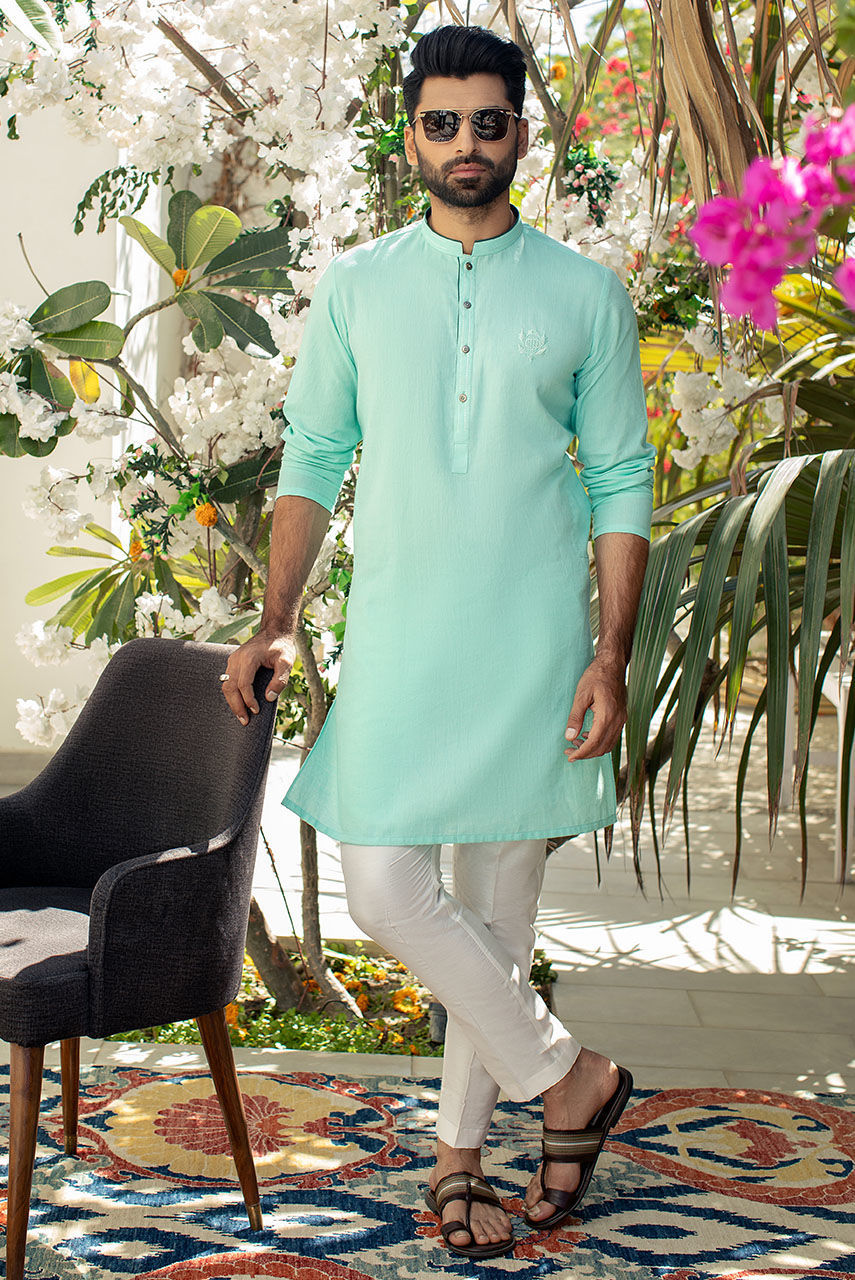 A turquoise blue chambrey kurta with detailing on the collor and embroidered DP logo.