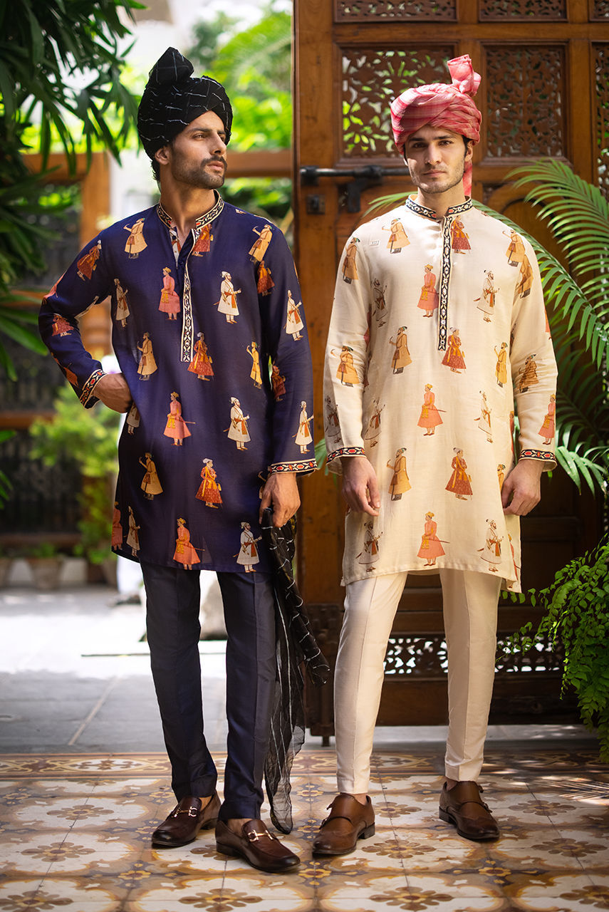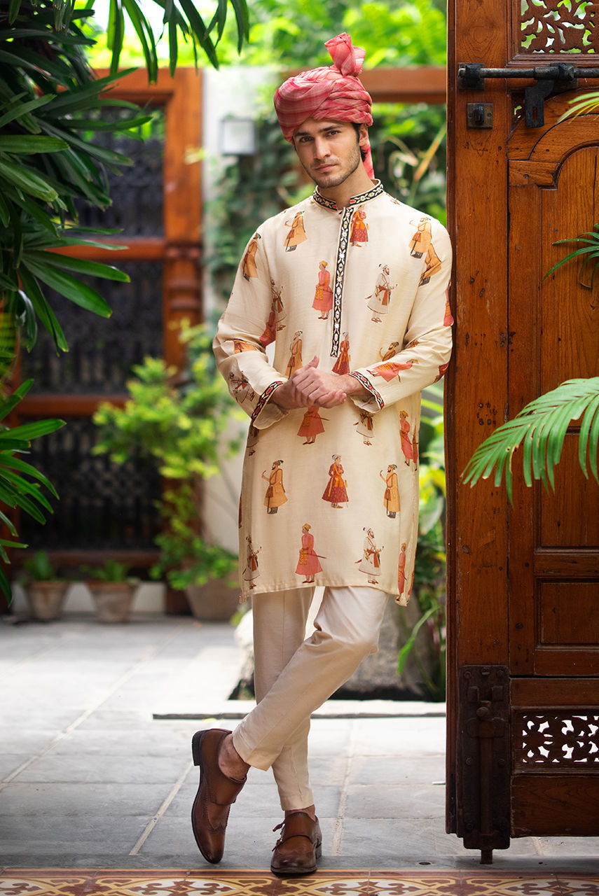 Off white charmeuse silk digitally printed Maharaja kurta pajama and an Organza digital print turban.