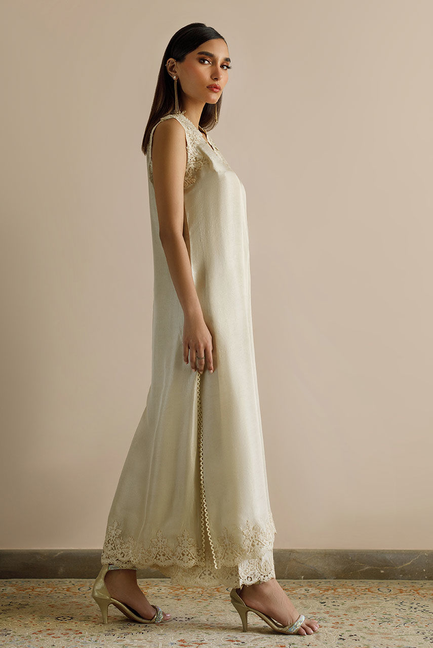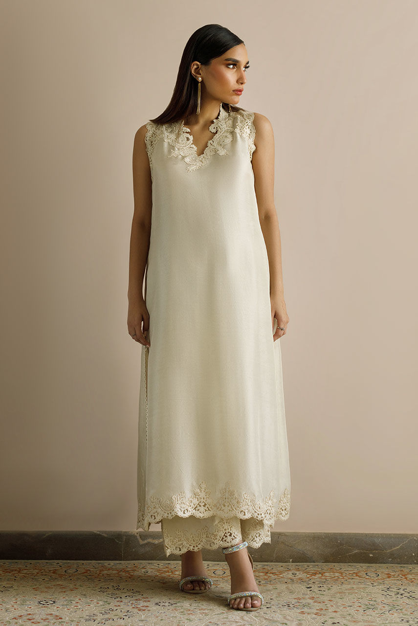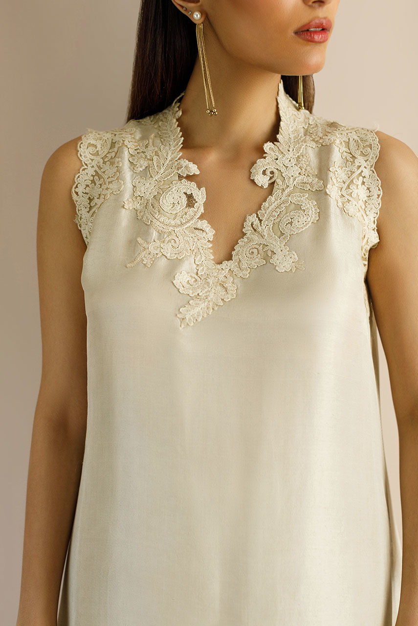 An ecru Raw Silk shirt and palazzo pants featuring baroque neckline motifs on the neckline, armhole and pants.