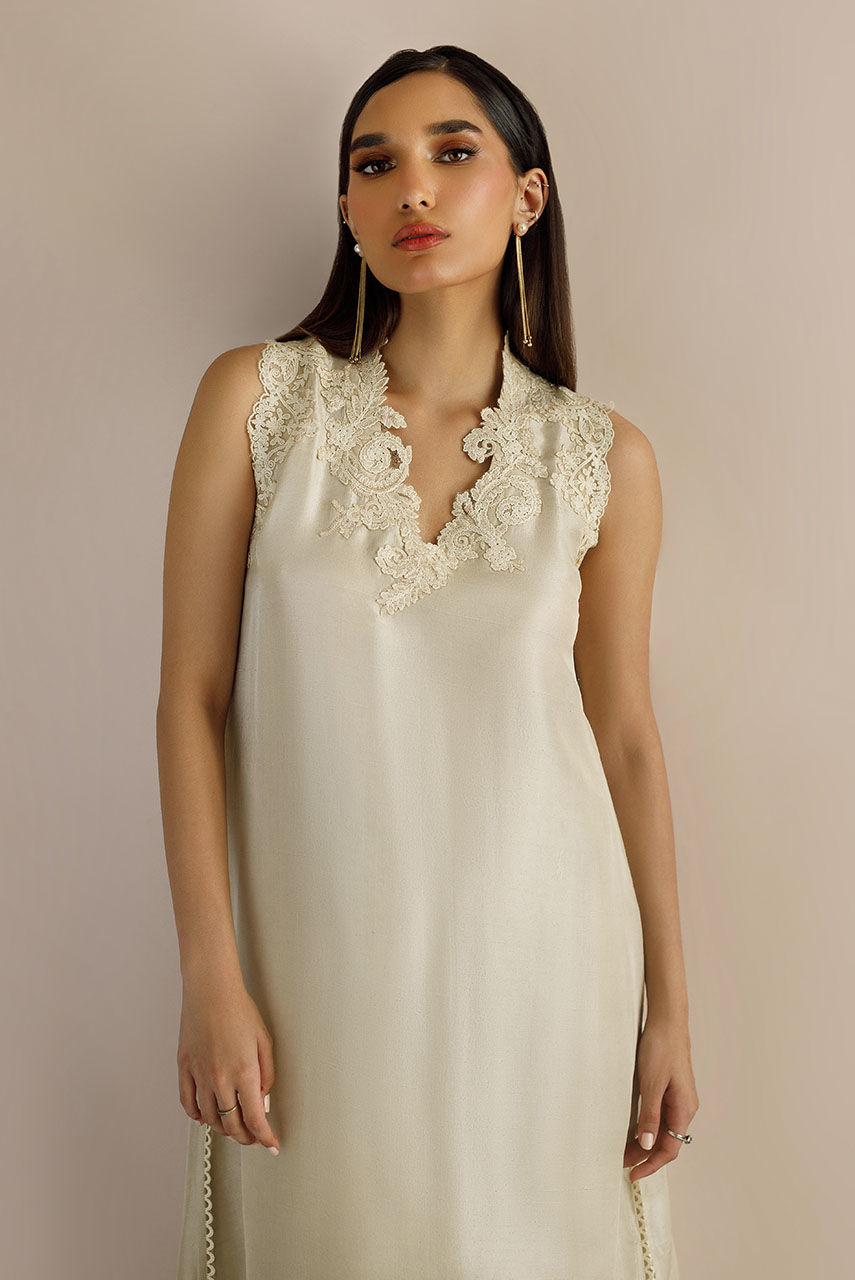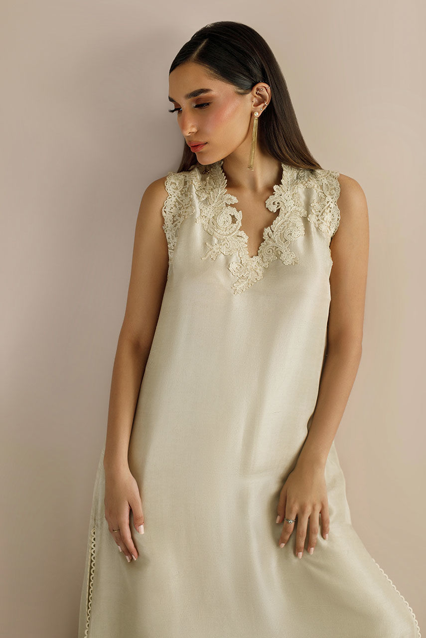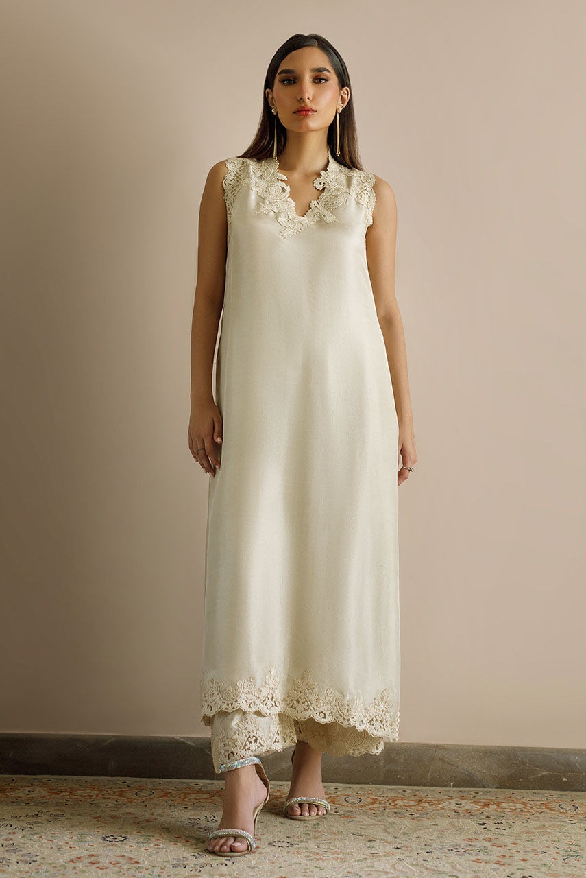 An ecru Raw Silk shirt and palazzo pants featuring baroque neckline motifs on the neckline, armhole and pants.