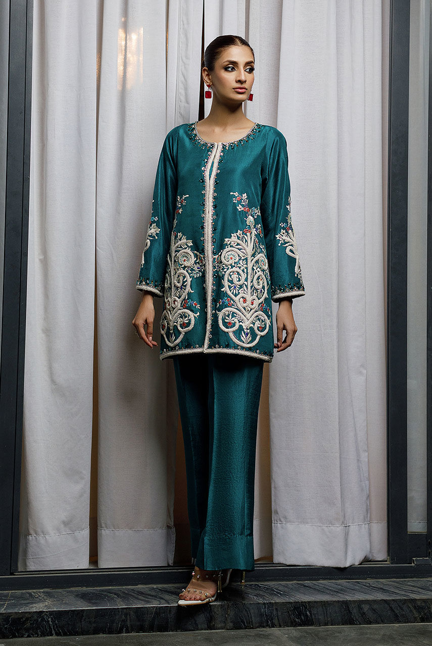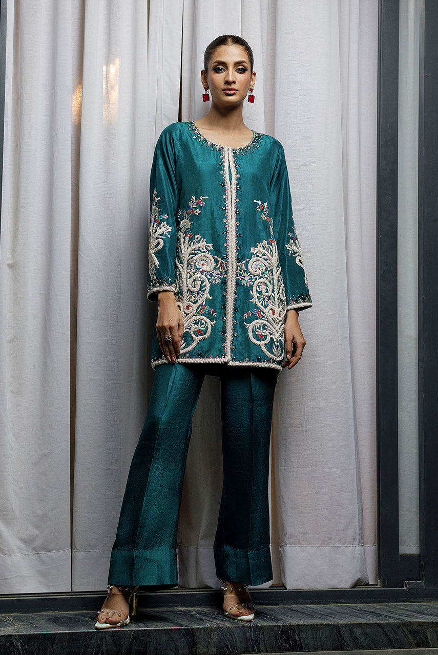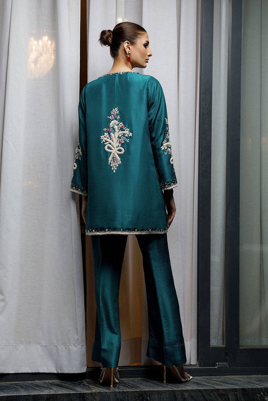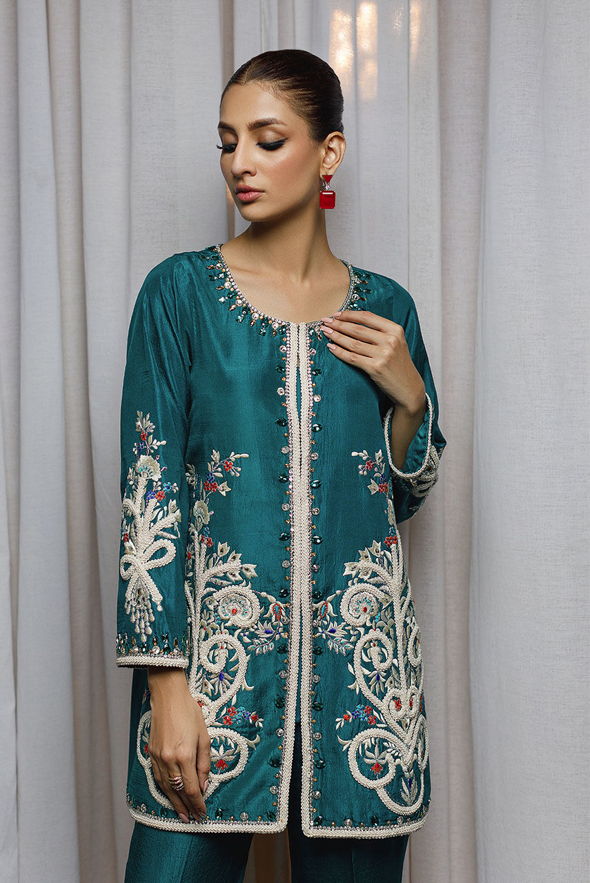 This pure raw silk jacket and bootcut pants featuring extensive hand embroidery in Resham Dori and diamonte make this piece exclusive and luxurious. It is embroidered taking inspiration from exclusive jewelry pieces