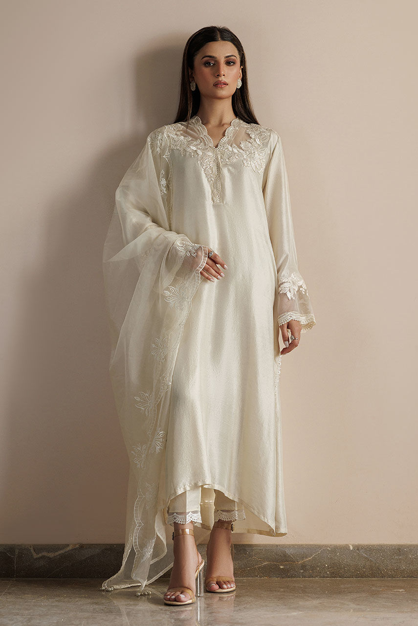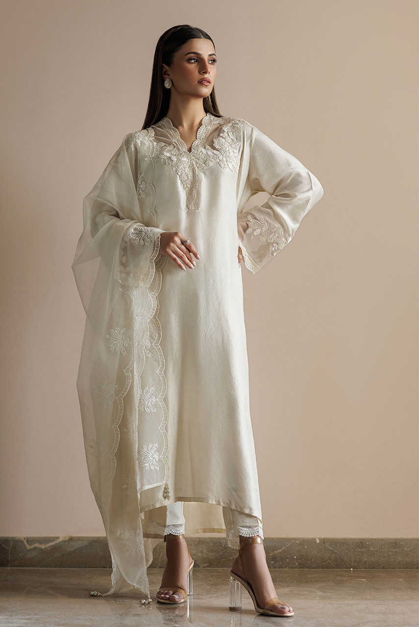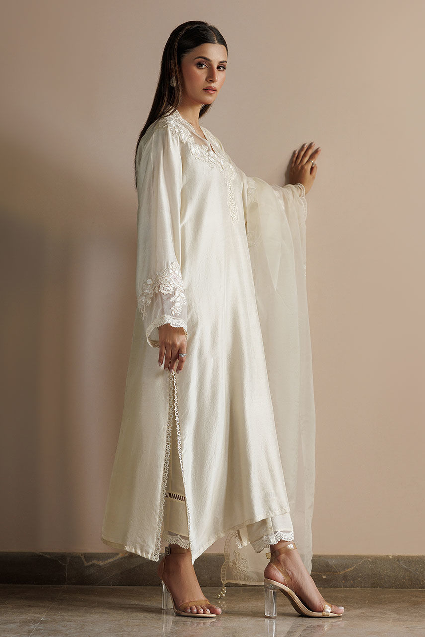 A pure raw silk tunic with delicate lace motifs and scalloped lace paired with straight pants finished with lace. The outfit is paired with an organza embroidered dupatta.