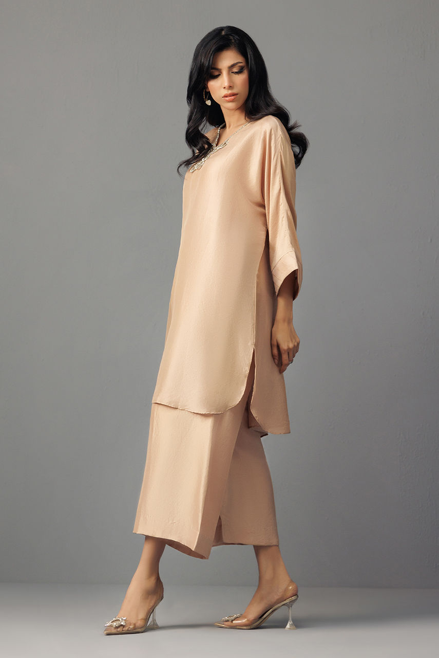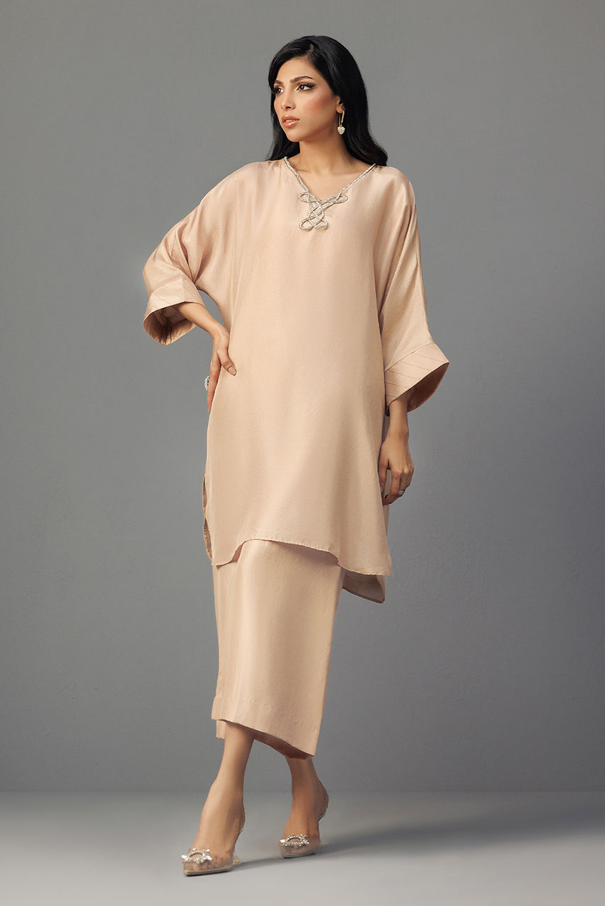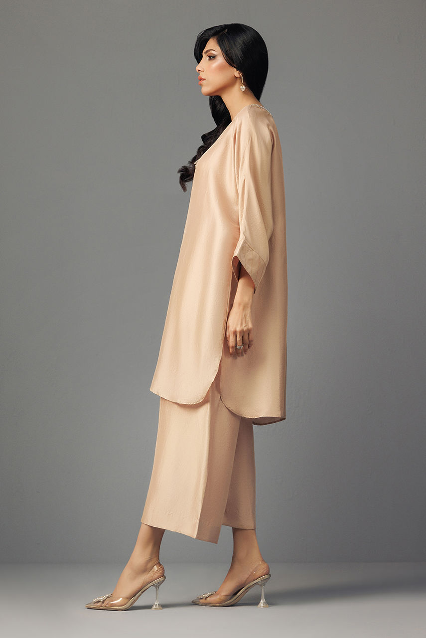 Cut in a pure raw silk fabric this co-ord set features a handcrafted jewel neckline with pleated detail on the sleeves. Paired with a raw silk palazzo