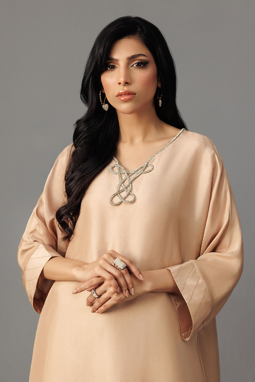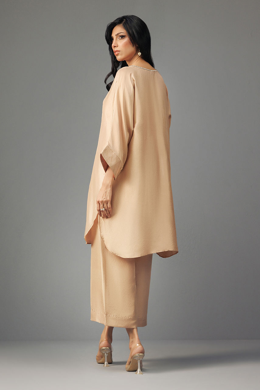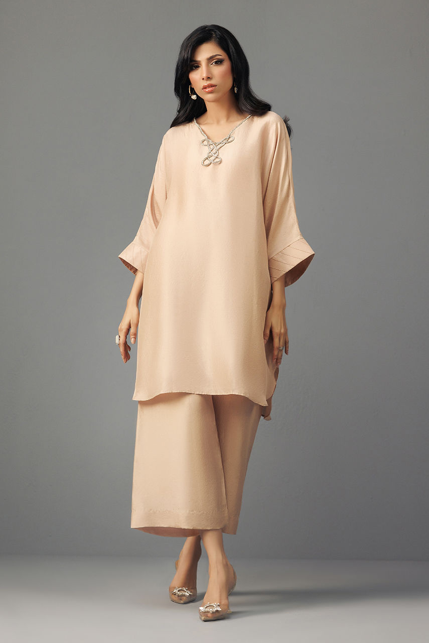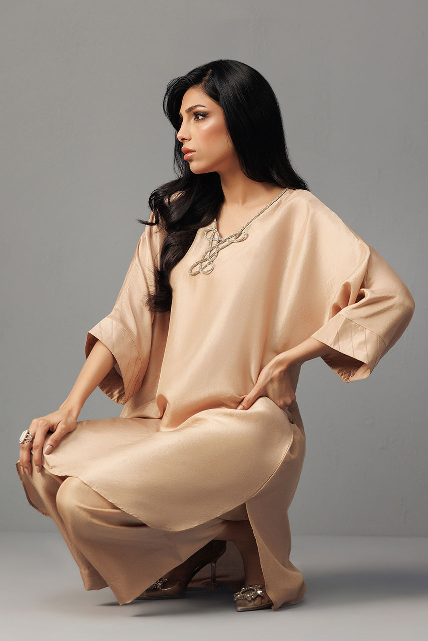 Cut in a pure raw silk fabric this co-ord set features a handcrafted jewel neckline with pleated detail on the sleeves. Paired with a raw silk palazzo