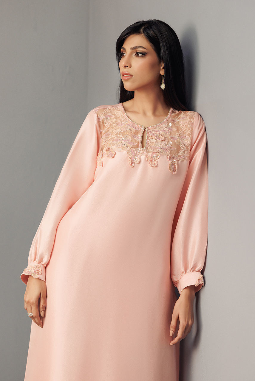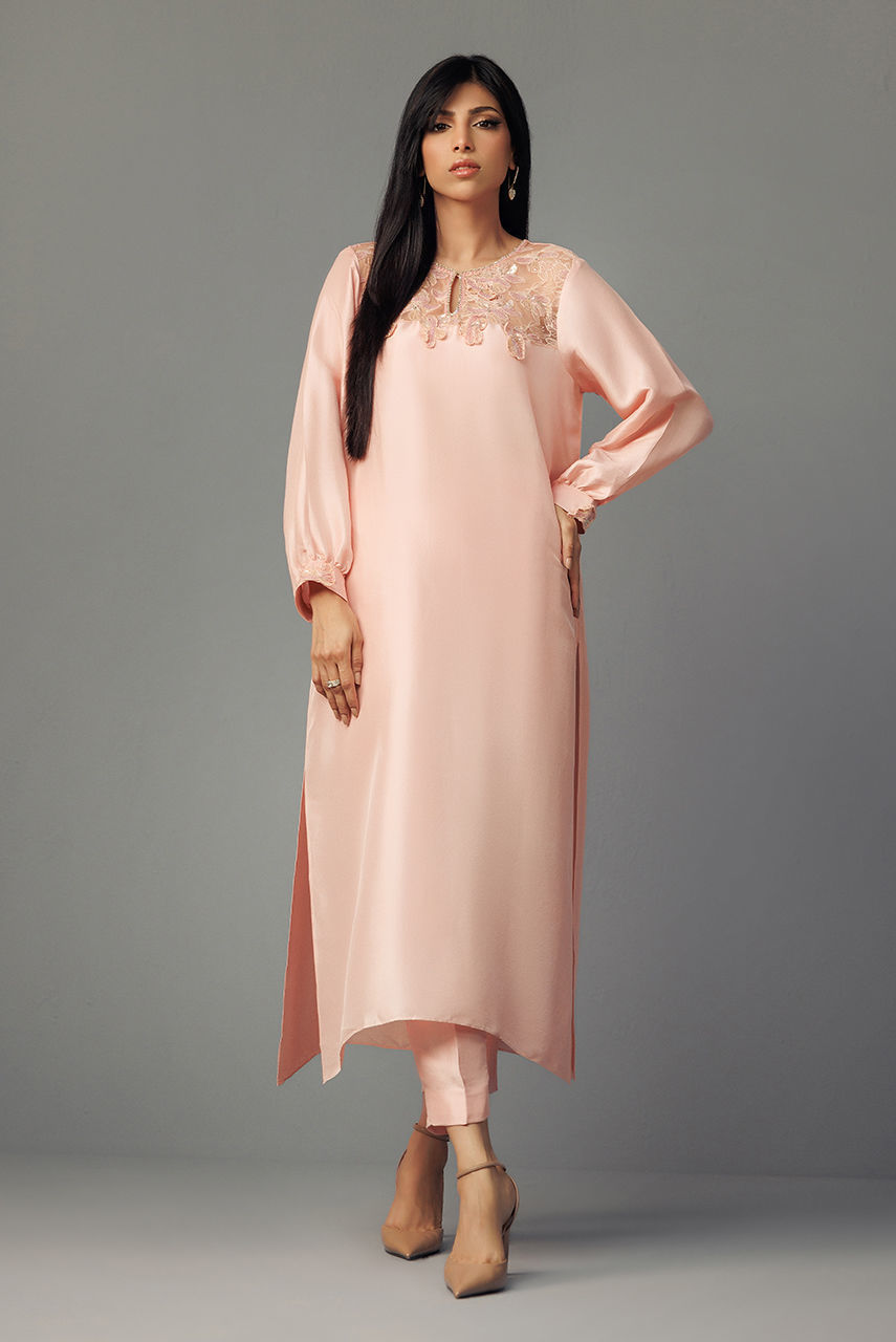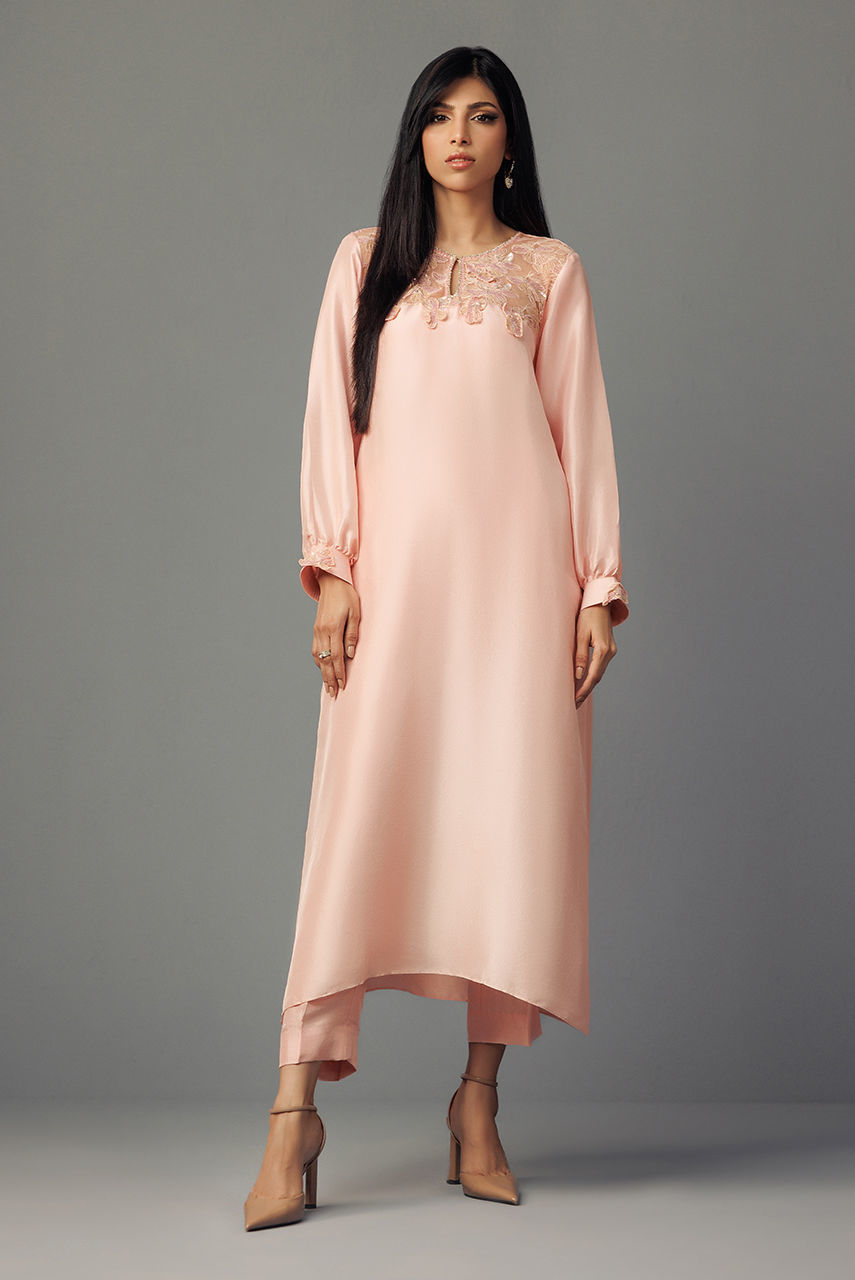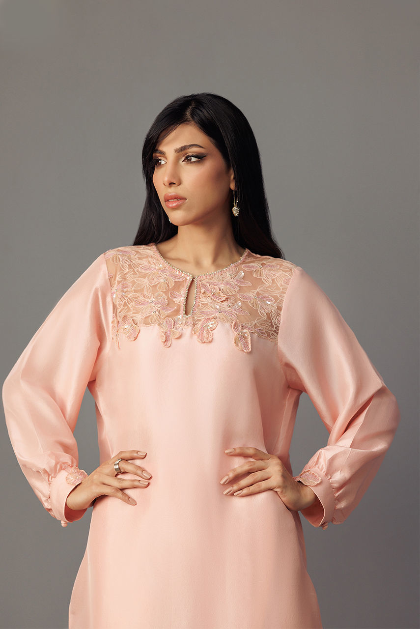 Pure raw silk shirt featuring embroidered net with 3d floral embroidery in Kat Dana, sequin, diamante and beads. It is paired with pure raw silk pants