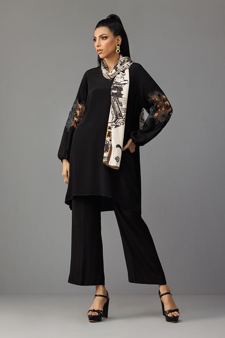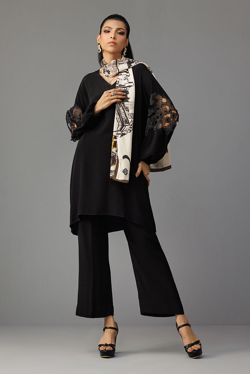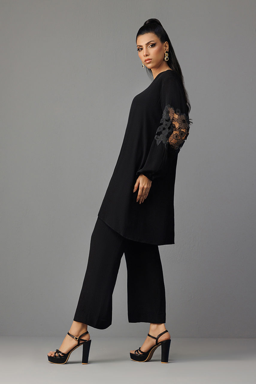 A black georgette top with cut work embroidery detail on the sleeves paired with georgette pants.
