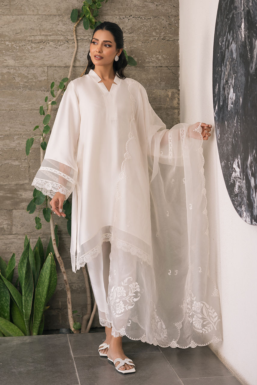 This ivory number is the epitome of understated charisma and elegance. The Shirt is finished with organza and Chantelle lace featuring a handcrafted brooch in diamante pearls and resham Embroidry. The trousers feature organza and Lace. The Dupatta in organza is embroidered in an ivory resham embroidery.