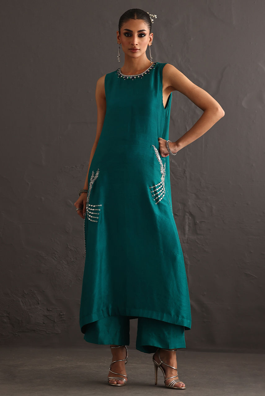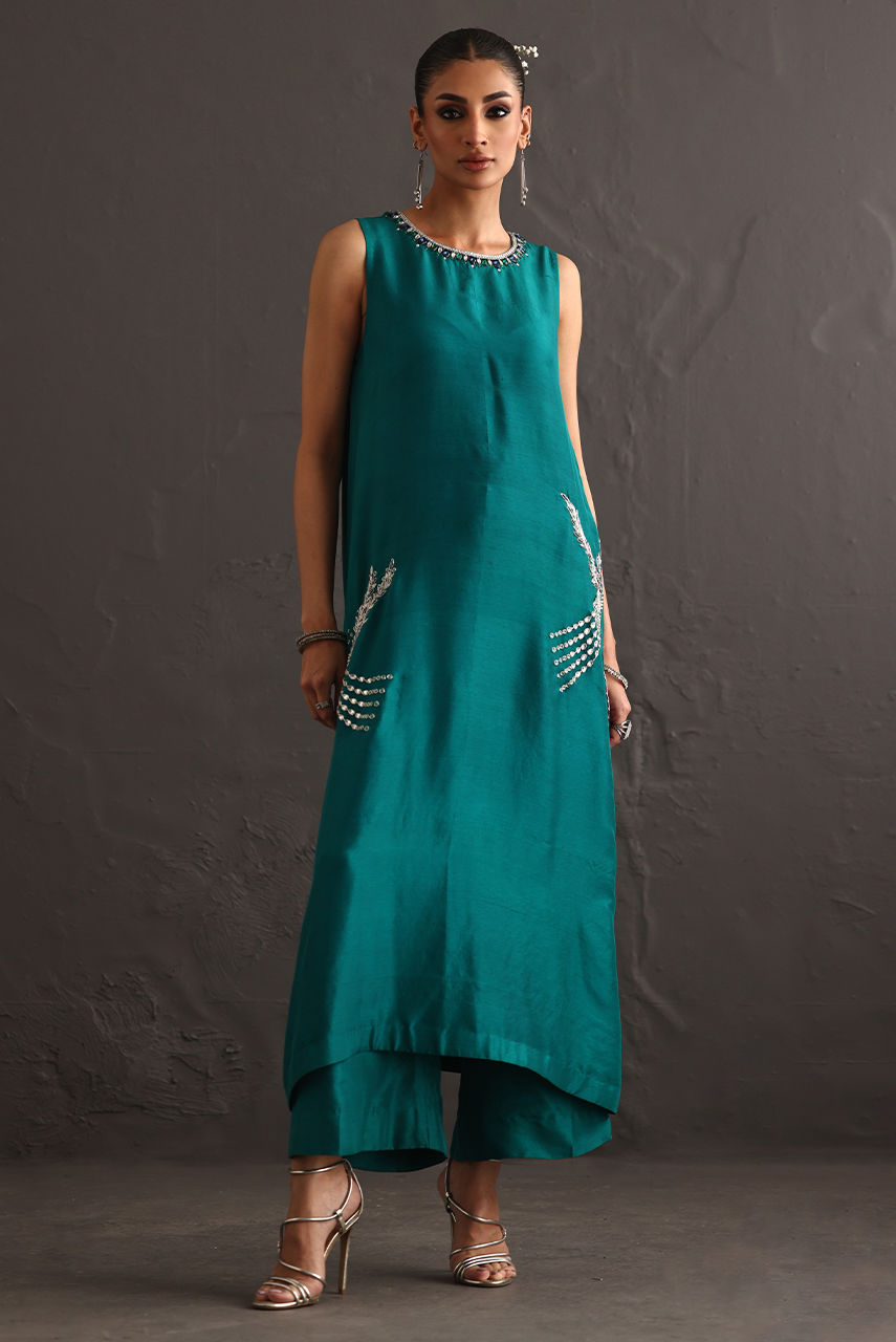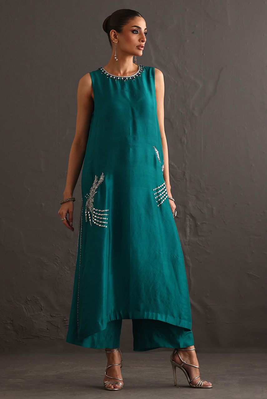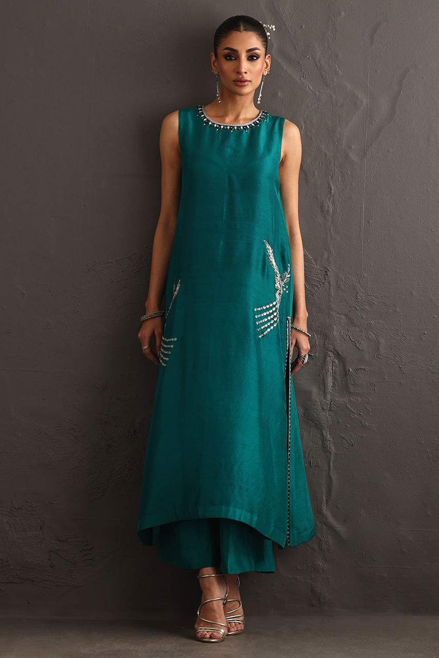 Cut from pure raw silk this piece is embroidered in crystal and stones. The overall aesthetic blends royal luxury with contemporary finesse.