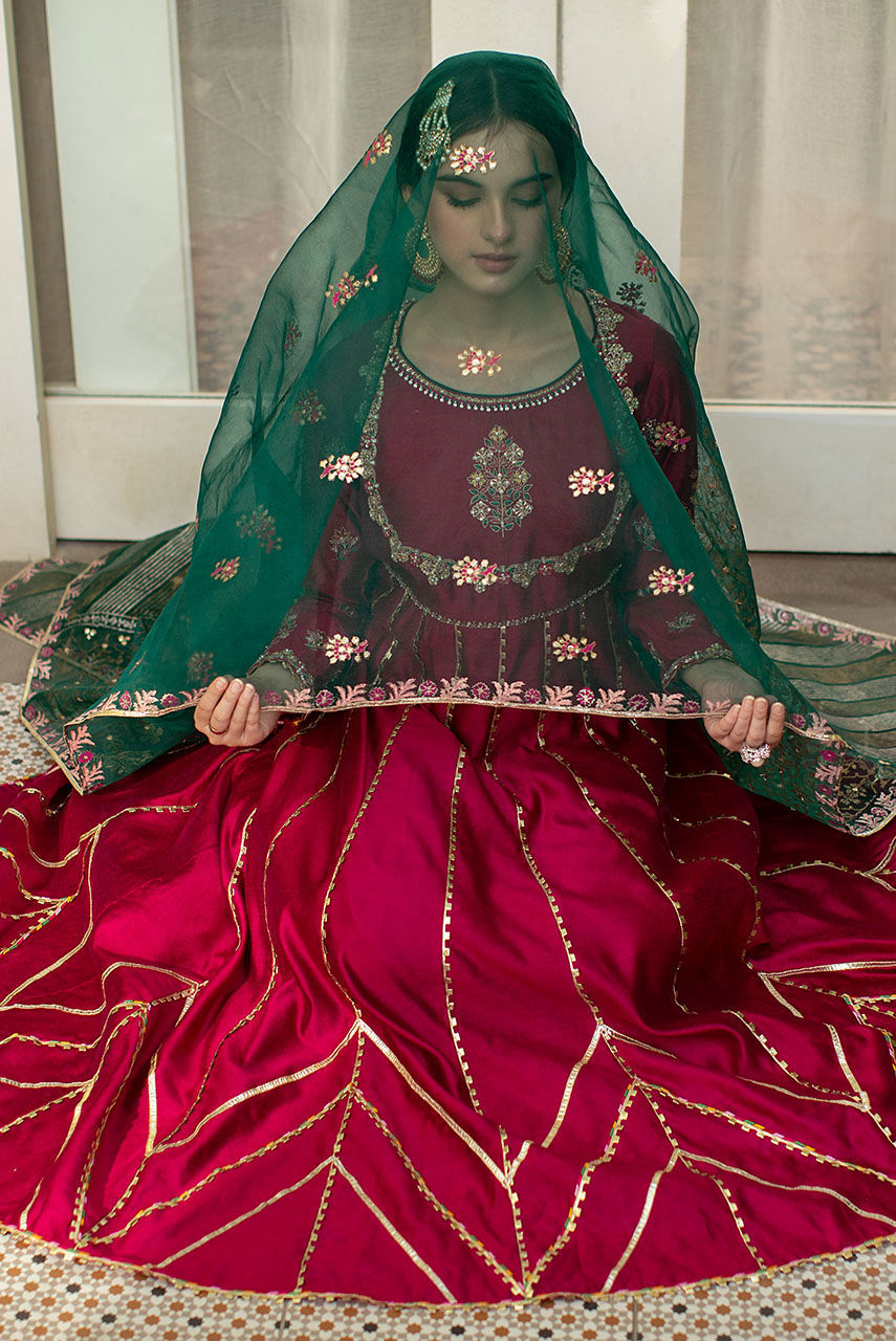 A magenta khaadi net kaalidar with detailed gotta work on the panels. The sleeves and body is intricately embroidered in resham, zari and zardozi. It is paired with a hand blocked organza dupatta. It comes with a silk churidar.