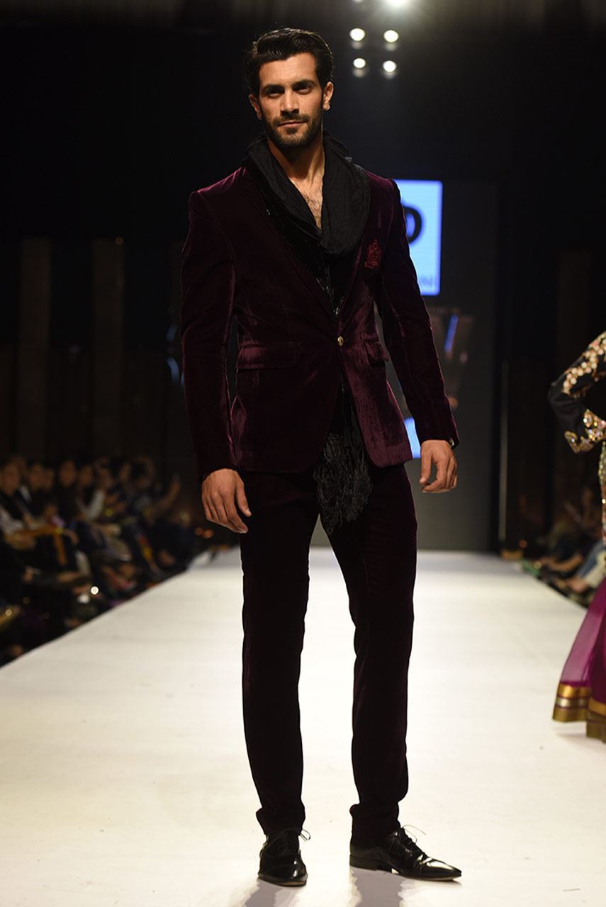 Deep plum velvet coat with pockets and gold buttons paired with velvet pants and a black inner shirt.