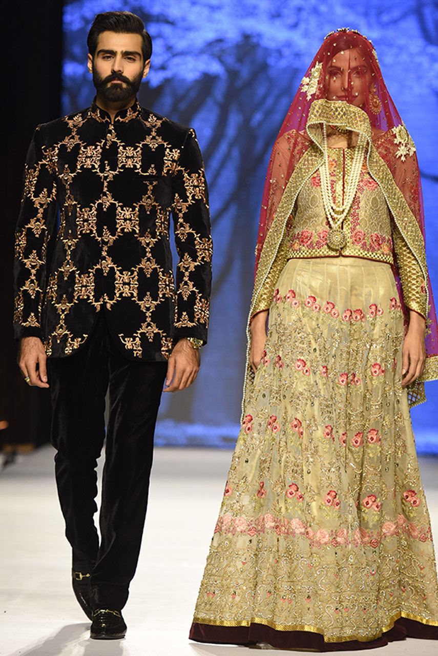 Pure atlas koti style top with embroidery on neckline, bottom and sleeves paired with a fully embroidered and embellished lehnga done with resham, kora dhaka, crystals, stones and sequins and a beautiful net dupatta with thread work flowers and sequins chan finished with borders.