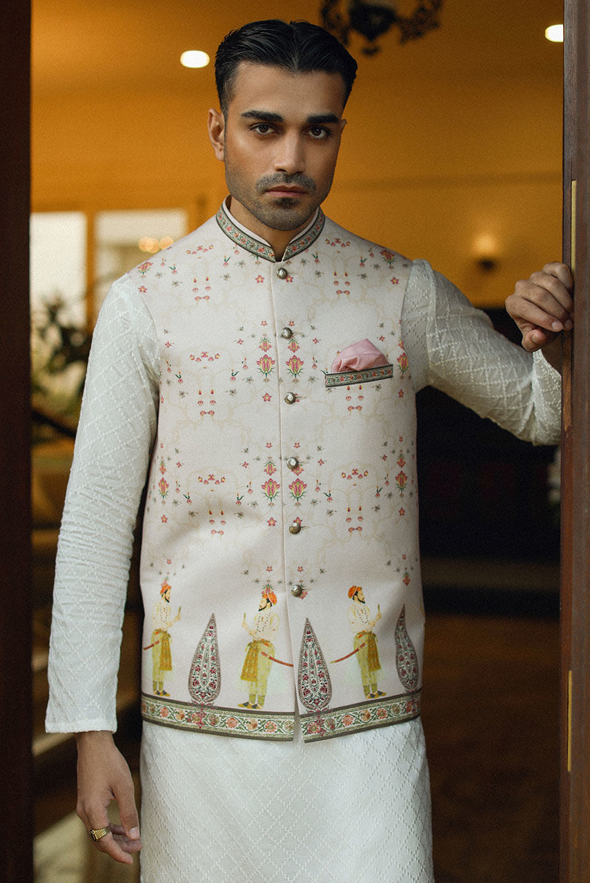 A white Raw Silk embroidered kurta pajama paired with a Raw Silk digital printed waist coat.