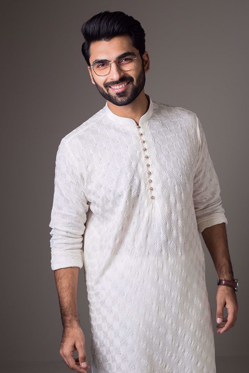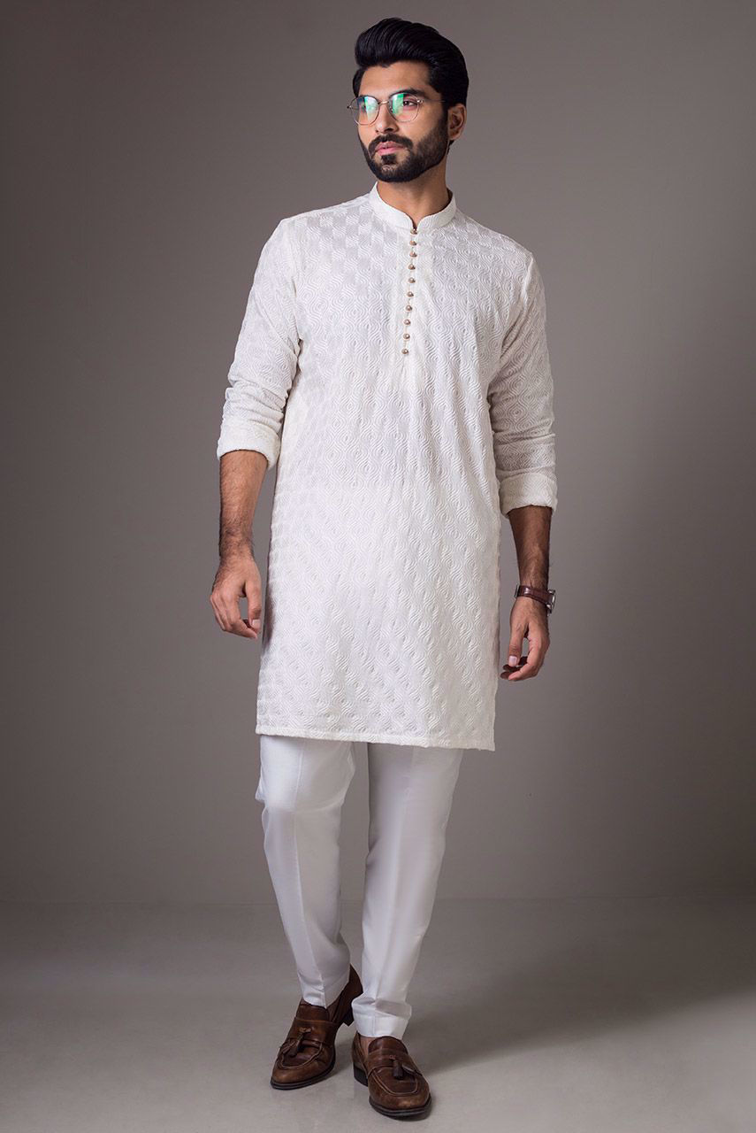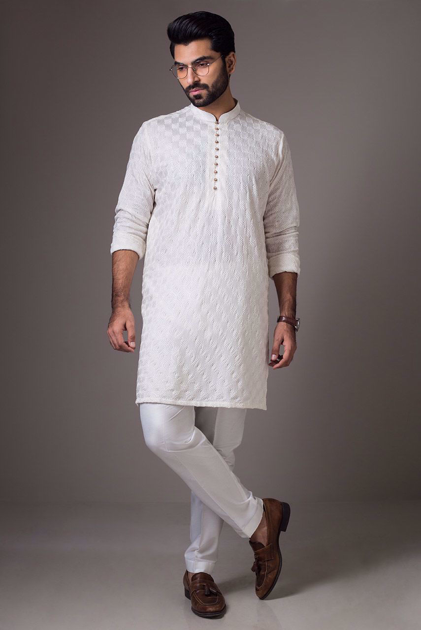 White raw silk embroidered kurta and cotton silk pajama with wooden loop button deatiling