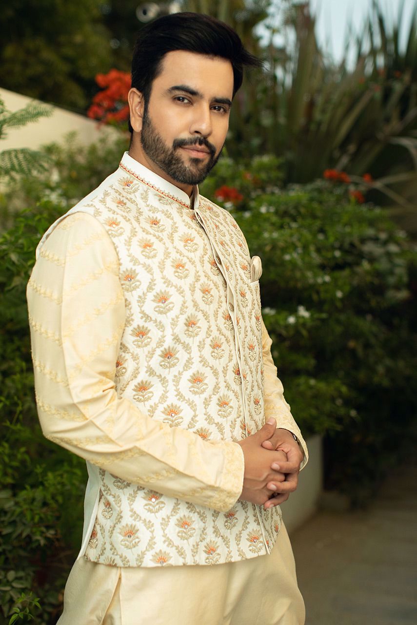 An off-white cotton silk kurta pajama with embroidered sleeves and on the neck. Pair it with a white  raw silk embroidered waist coat.