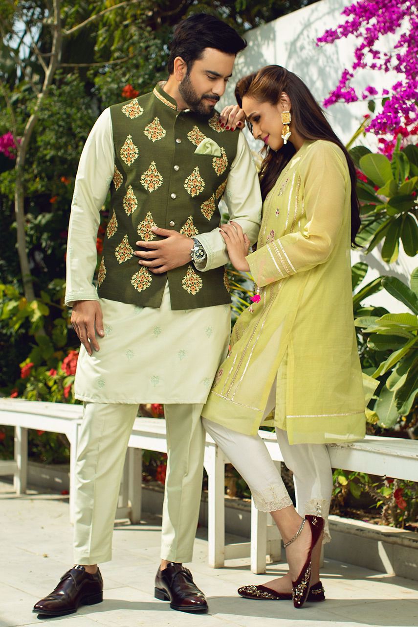 A pastel green cotton silk kurta pajama with embroidered motifs on the kurta. Pair it with a raw silk embroidered waist coat with embroidered motifs