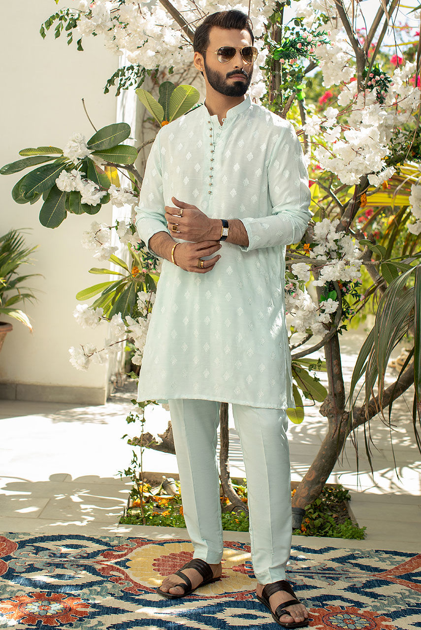 A mint blue embroidered raw silk kurta and a cotton silk a pajama.