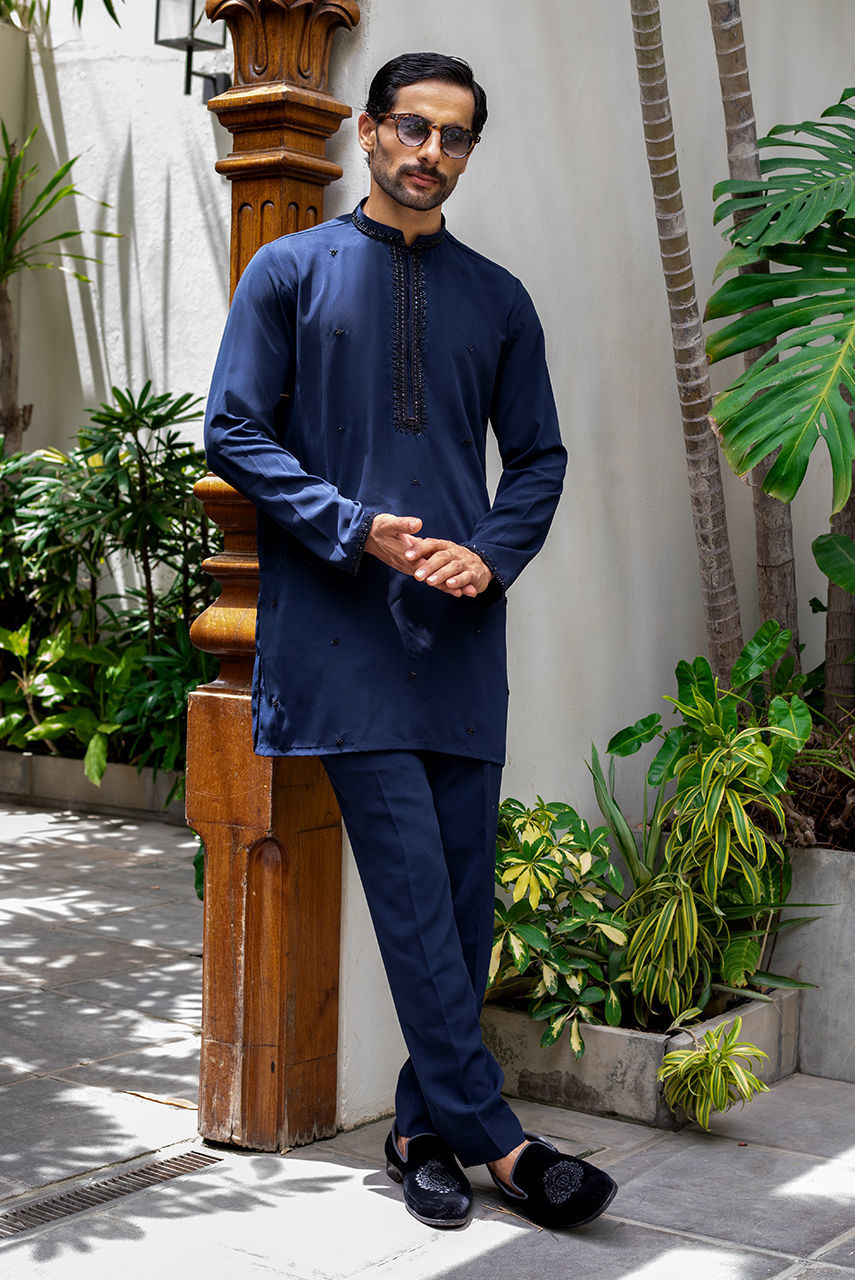 A khaddi silk deep blue kurta pajama with hand embroidered on collar, placket and sleeves.