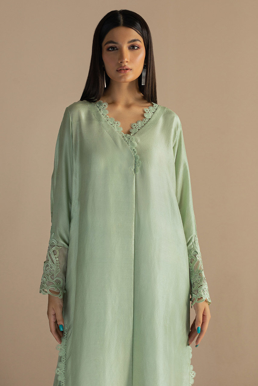 Color: Mint Green Fabric: Raw Silk Work Details: Lace Detailing