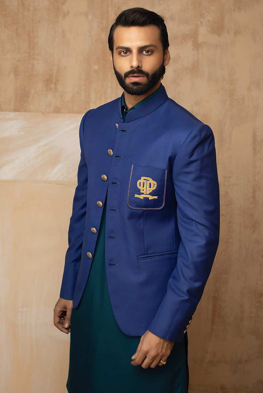 A blue suiting prince coat with a hand embroidered DP logo