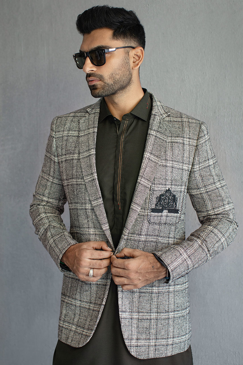 Black and white check woolen jacket with a patch pocket and a DP logo