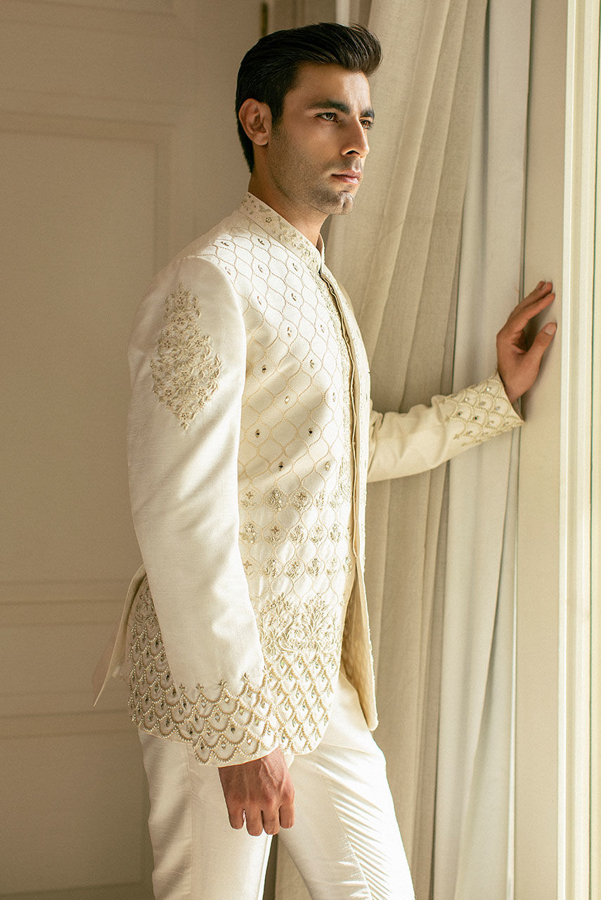 A white Raw Silk prince coat and trousers with extensive intricately detailed hand embroidery on the coat. Complemented with an off white organza turban with hand printed pattern and can be customized in any color.