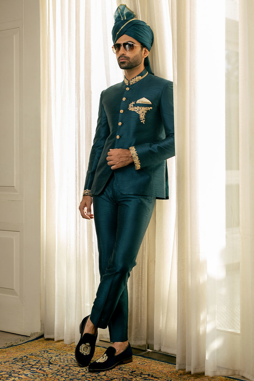 A teal raw silk prince coat with resham and hand embroidered collar, cuff and buttons, can be paired with a raw silk trouser, velvet shoes with hand embroidered logo and an organza turban