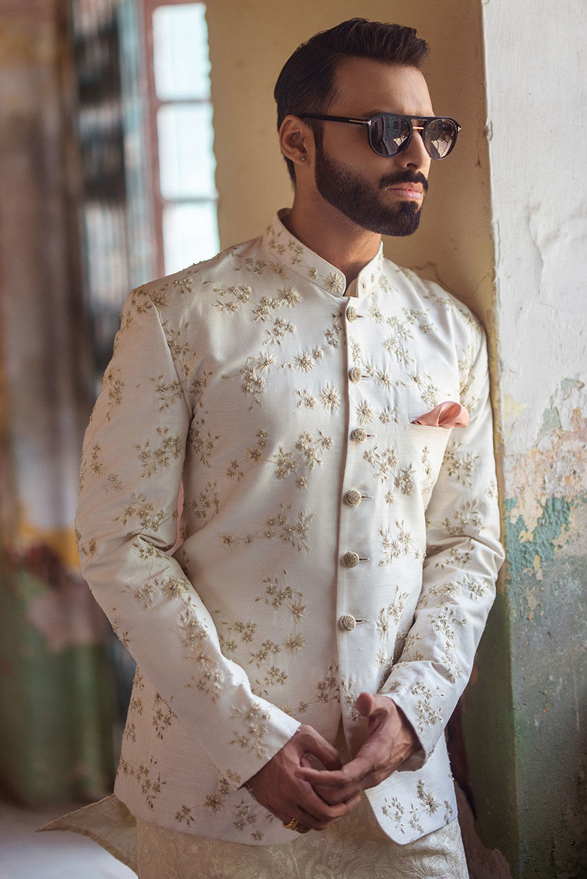Step into timeless elegance with our off white raw silk Prince Coat, featuring exquisite resham and hand embroidery on the jacket and buttons. This meticulously crafted piece combines luxurious fabric with intricate detailing, making it the perfect choice for weddings, formal events, or any occasion where sophistication and style are paramount.