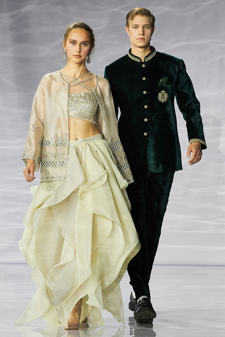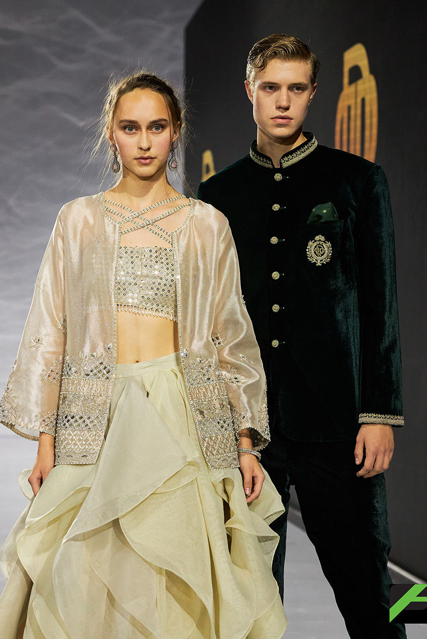 A deep green velvet jacket, accentuated with gold buttons detailing, exuding timeless elegance.