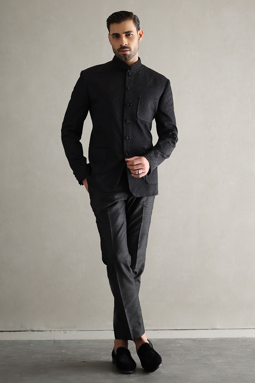 A pure atlas black 3 pocket classic nehru with hand embroidered collar and button complimented with black raw silk trousers.