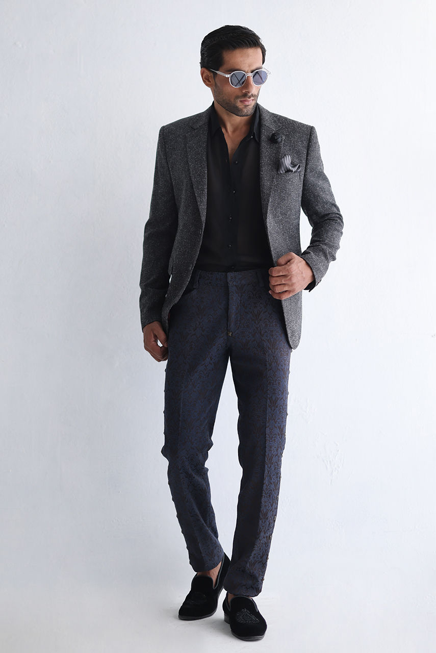 A charcoal grey men's woolen jacket exudes timeless elegance paired with a black shirt and a jamawar trouser perfect for a casual or formal occasion.