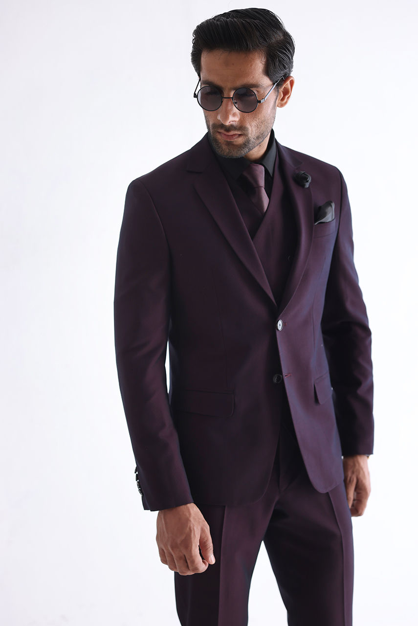 Elevate your style with our Plum 3-Piece Suit, meticulously crafted from premium suiting fabric. This ensemble exudes unique elegance, featuring a tailored jacket, vest, and trousers for a distinctive and refined look.