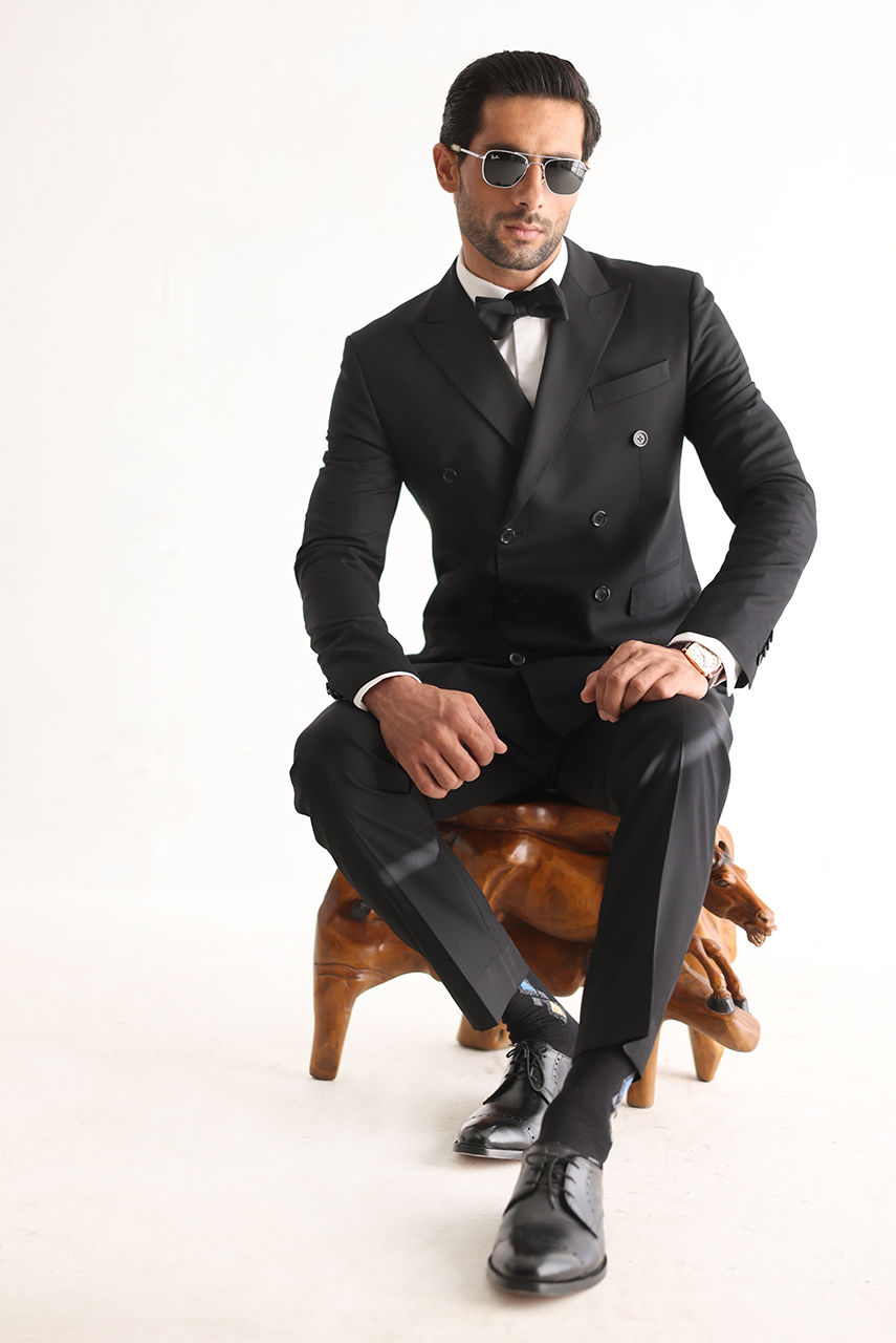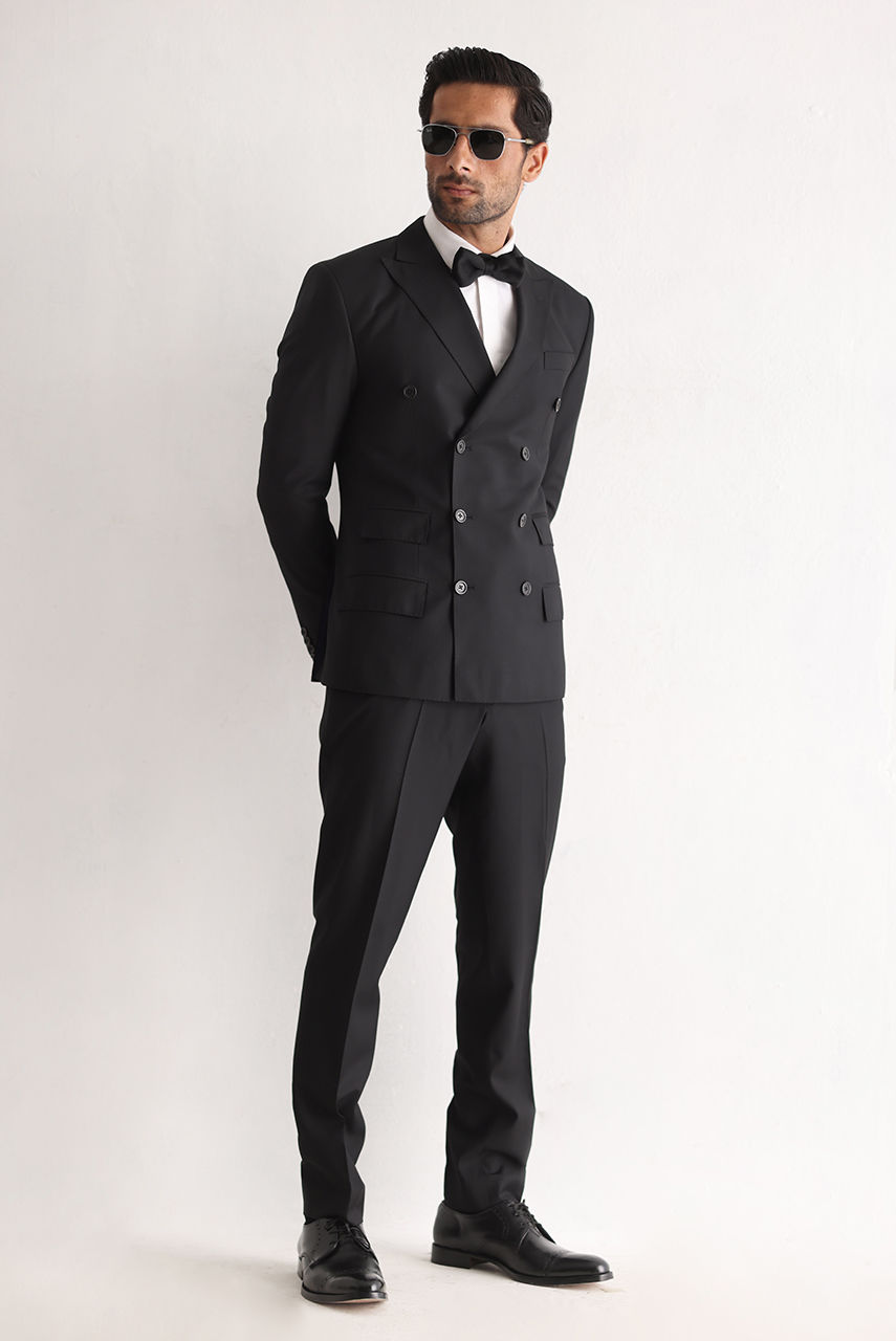 Elevate your style with our Black Double-Breasted Suit, meticulously crafted from premium suiting fabric. This ensemble exudes timeless sophistication and confidence, making it perfect for formal occasions and professional settings