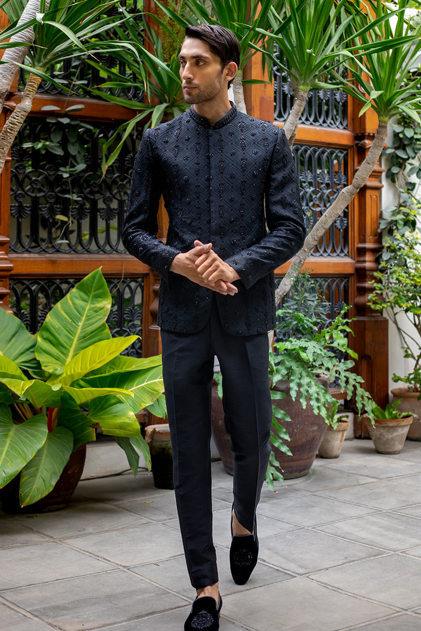 Make a grand entrance with our fully embroidered black Prince coat, featuring intricate hand embroidery on the collar and buttons. This luxurious piece combines the richness of detailed embroidery with timeless design, making it the perfect choice for weddings, formal events, or any special occasion where elegance is paramount.