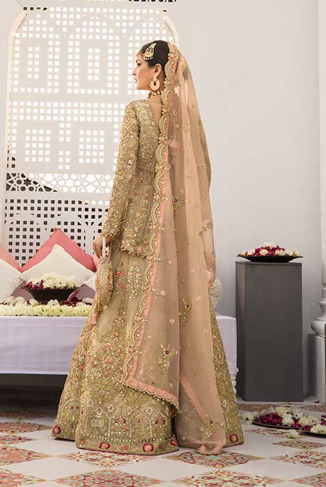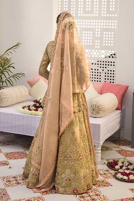 A bridal with breath taking details in shades of gold, blush pink with fuchsia accents. The maysuri shirt and lehnga are extensively hand worked in resham, zardozi, crystals, pearls and French knot. Paired with blush pink dupatta which has a beautiful scallop and hand work all over in zardozi, resham crystals and pearls.