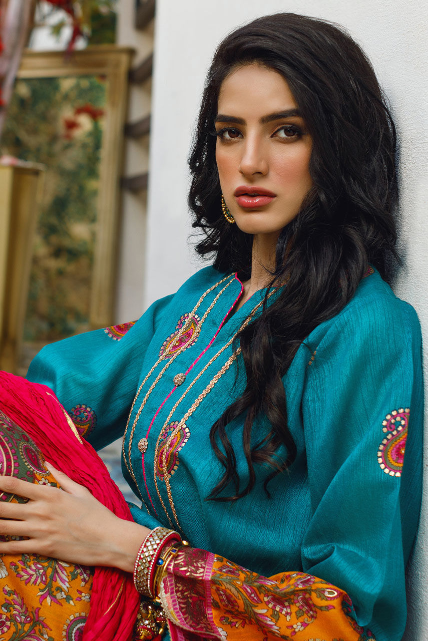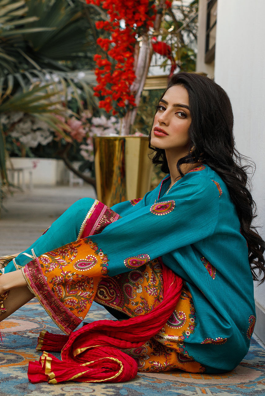 A classic tunic featuring screen print, lace and buttons it is paired with a silk trouser with gota detail and a crushed dupatta.