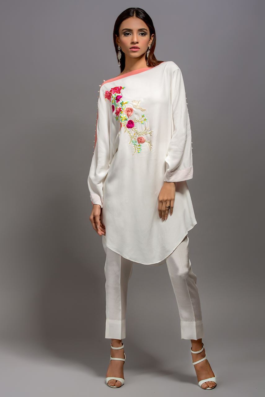 Shirt with an embroidered motif and pearl detail on the sleeves paired with a silk trouser.
