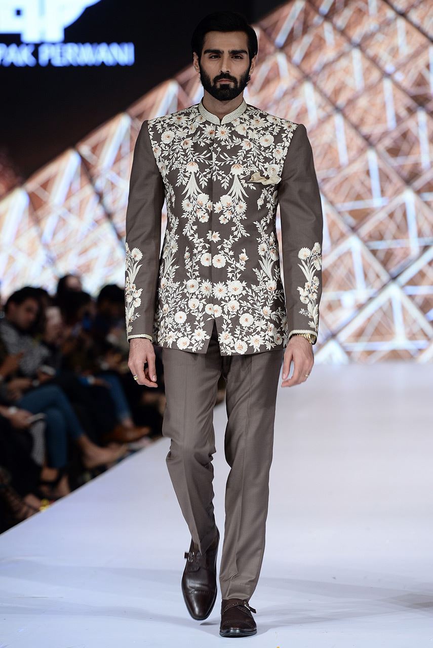 Pewter grey jacket with embroidery in cream and dull gold styled with straight pants.