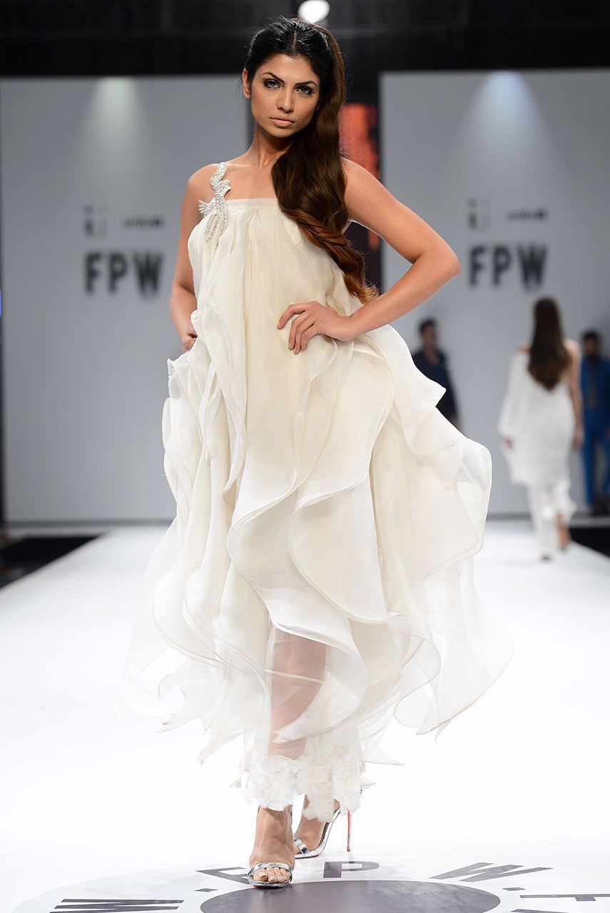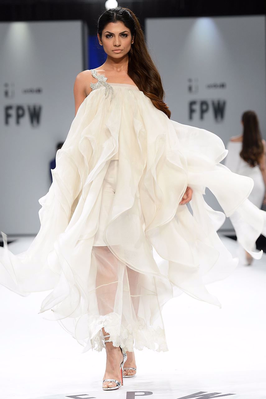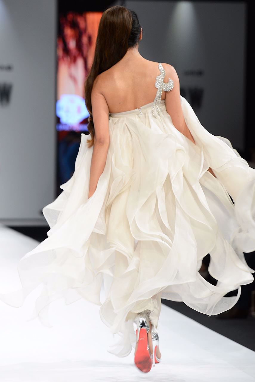 One shoulder petal dress constructed with layers of organza with a silver hand embellished broach paired with a linen trouser finished with embroidered organza.