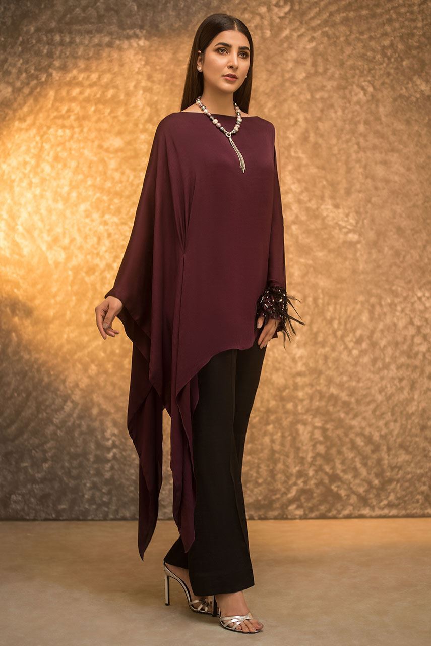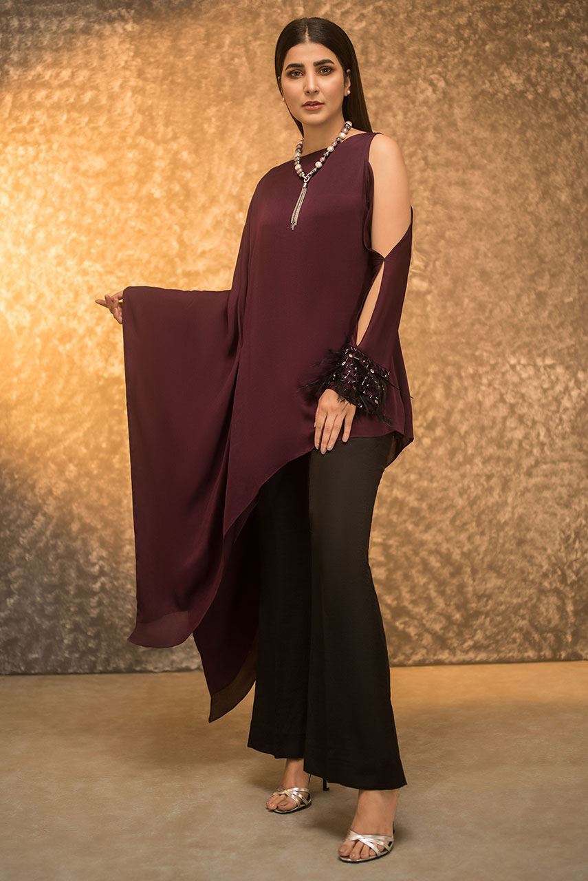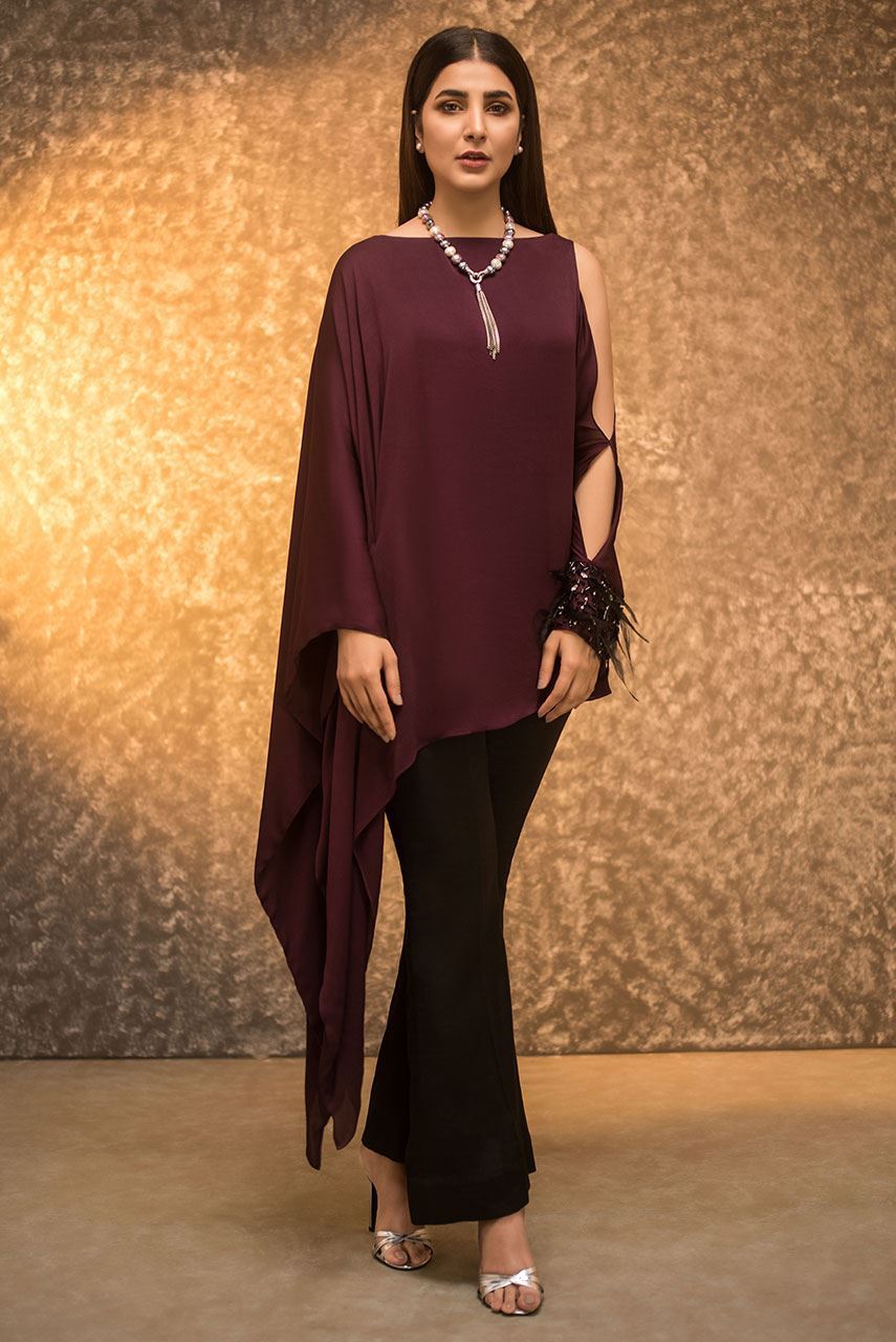 Draped asymmetrical top in eggplant purple crepe silk. It has a sleeve with a slit trimmed with an organza cuff extensively encrusted with feathers, crystals and beads.