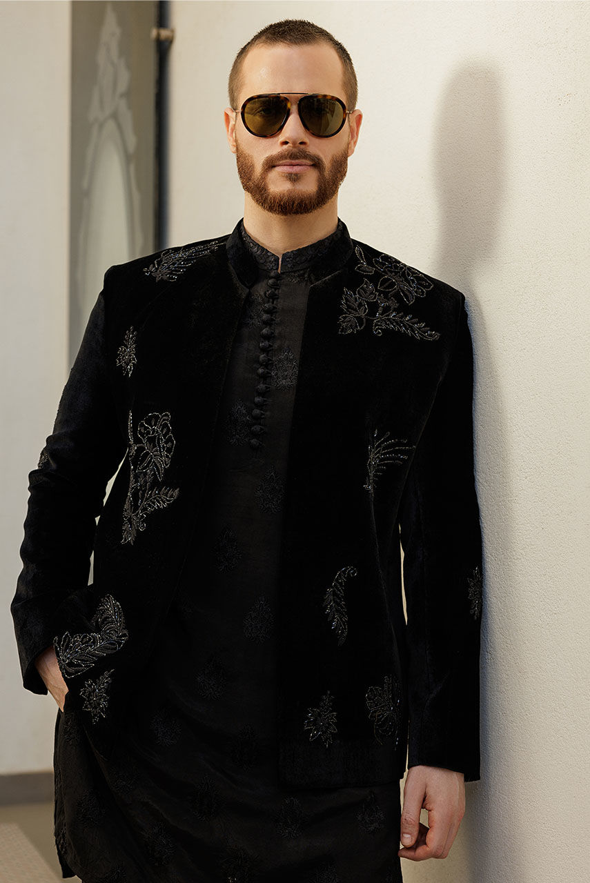 Command attention with this long black velvet prince coat, a masterpiece of grandeur and refinement. The rich velvet fabric exudes sophistication, offering a luxurious texture that speaks of timeless elegance. with meticulously hand-embroidered motifs, each stitch tells a story of artisanal craftsmanship.