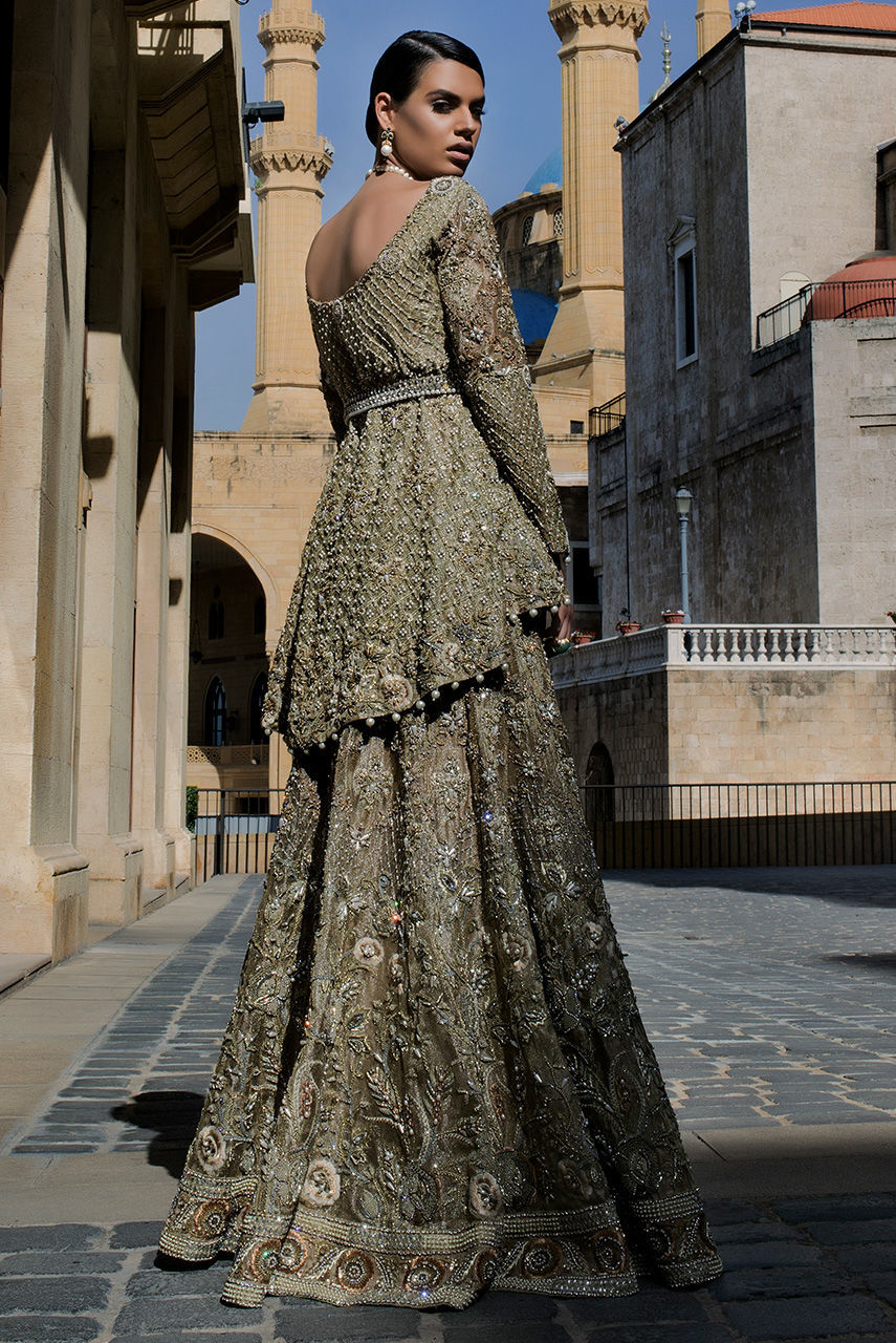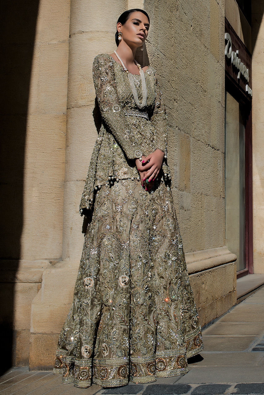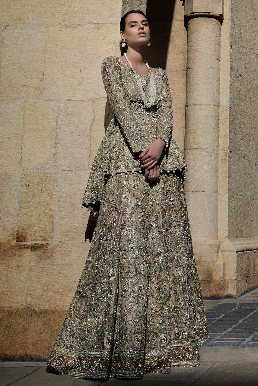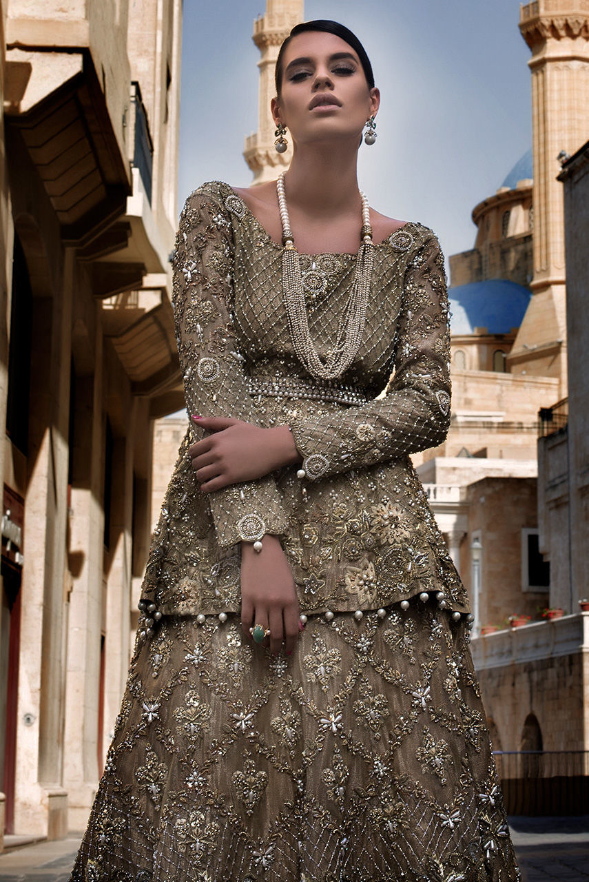 The grand gold bridal stands out due to its uniqueness and the perfect fusion of modern cut and traditional embroidery.