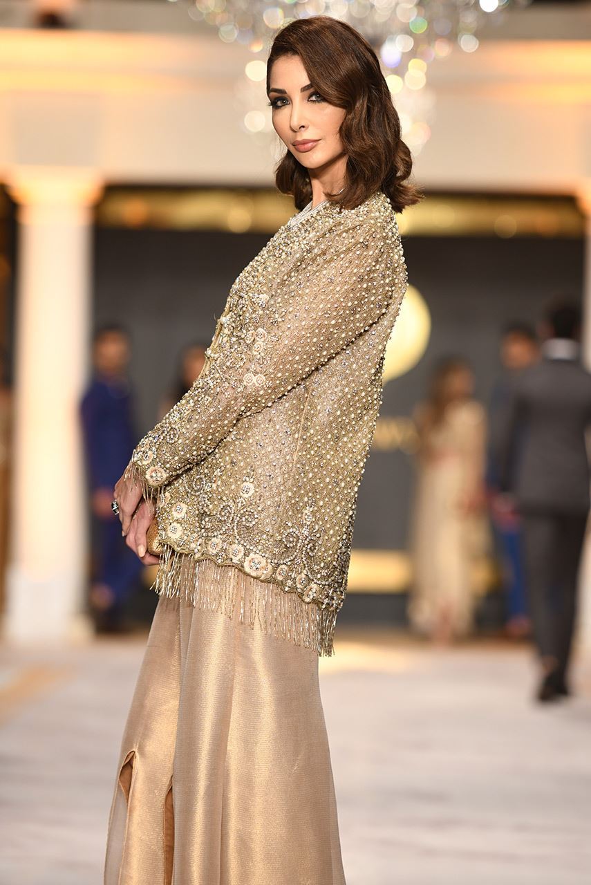 A modern jacket in a gold zari net which is elaborately worked with resham pearls and crystals. It is paired with a double layered slit-pants in a gold shimmer meysori net.