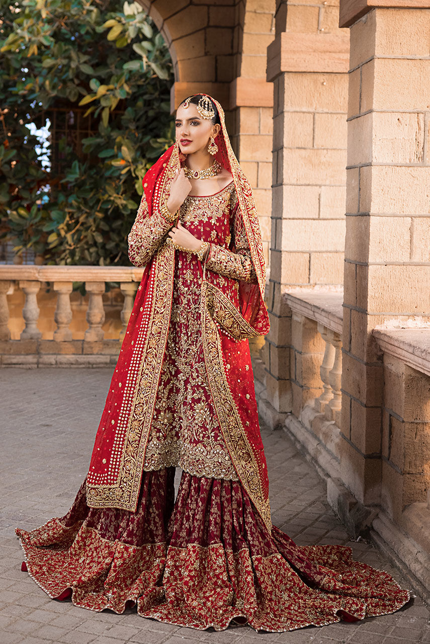 The dress contains tones of Red, moving from sanguine red dupatta, scarlet red kameez to the wine red gharara impeccably into the blushing bride dress. The borders of pure khaddi net dupatta are decorated with kamdani, zardozi, Resham and crystals. And the kameez has the handwork of gold but with the other hand techniques; zardozi, Resham and crystals. This is an A-line silhouette with a wide boat neckline. The gharara is the jamawar fabric extended enough to embrace the floor and glide beside our bride when she walks.