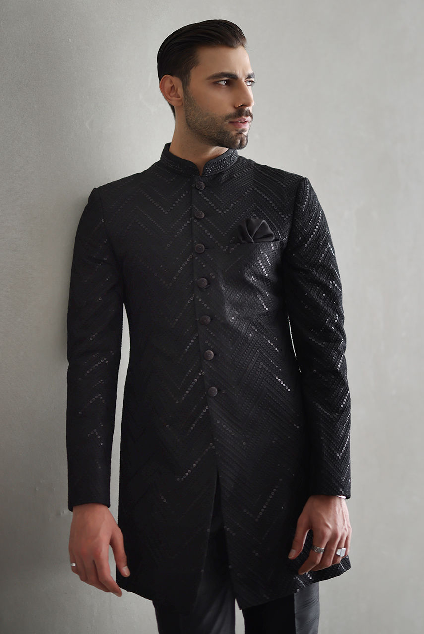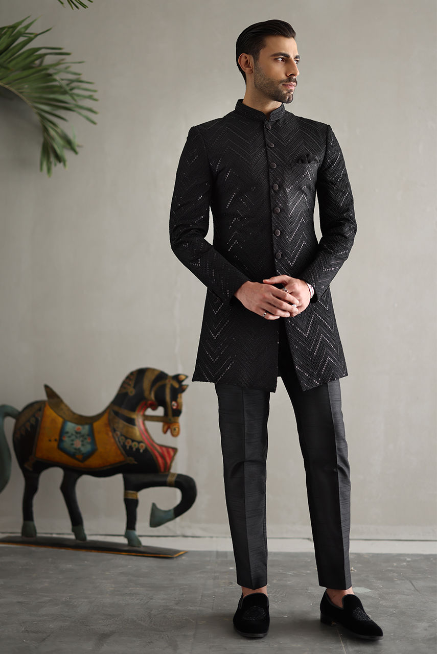 Full embroidered black chevron indo western with hand work on buttons and collar complimented with raw silk trousers.