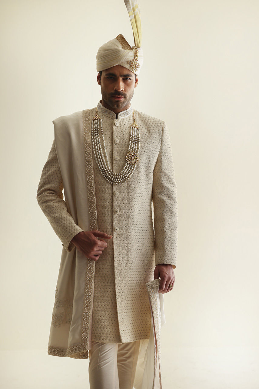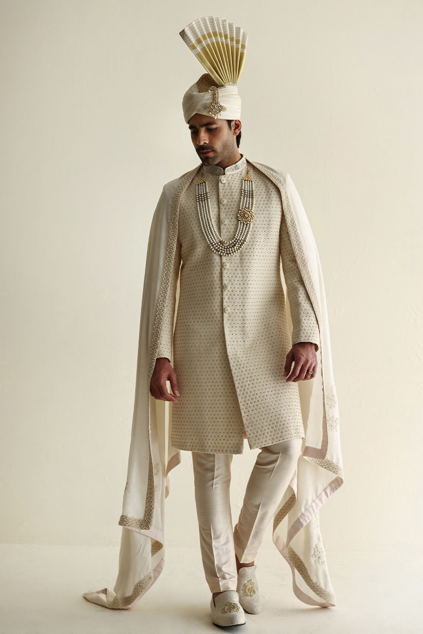 Fully embroidered silk fabric adorned with intricate handwork motifs all over, perfect for creating a luxurious, statement ensemble paired with a raw silk shawl with hand embroidered motifs