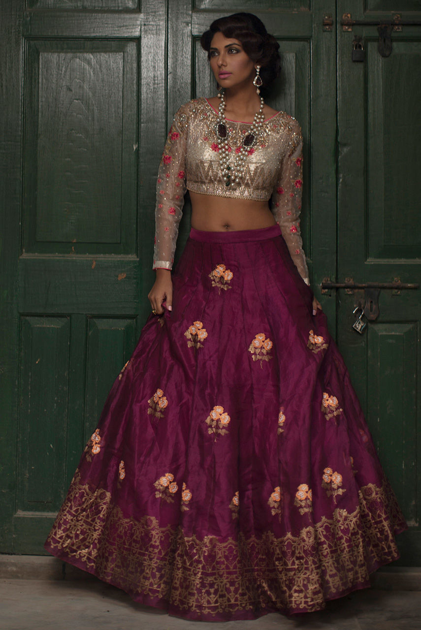 Deep plum screen printed and embroidered organza lehnga paired with a beautiful silver choli heavily worked with resham, diamante, sequins and pearls. A rich charmeuse screen printed shawl is added to complete the look.