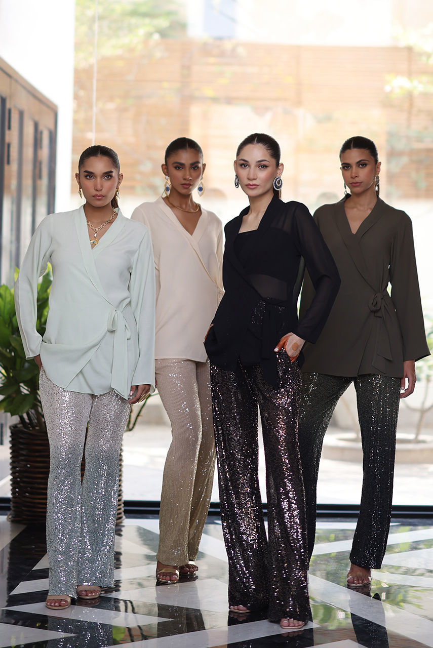A wrap around Georgette top paired with sequin bott cut pants. The outfit exudes glamour making it a perfect choice for your next festive brunch or soirée