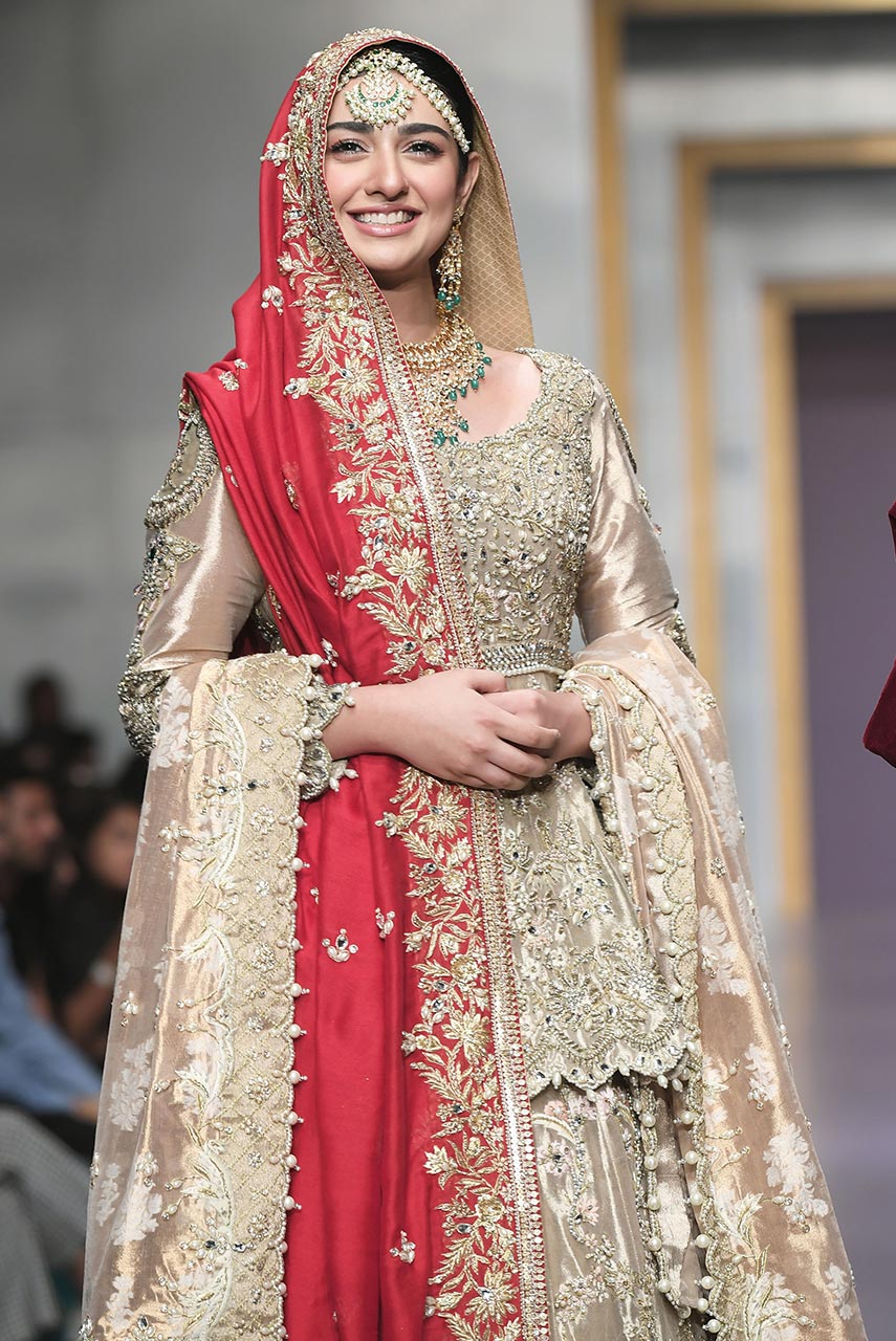 An extensively hand worked lame peplum and lehnga paired with a gold mesh dupatta. The lehnga has a beautiful scenic imagery comprised of peacocks and Cyprus paisley. The handwork is based on heritage zardoze embroidery and a cotton net red dupatta with extensive hand worked border and Chan in zardozi gotta crystals and pearls. Can be paired with: 1) Gold Dupatta 2) Red Dupatta